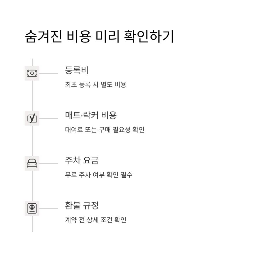 처음에 제시하는 월 회비 외에도 등록비, 매트 대여비, 락커 이용료 등 생각보다 많은 추가 비용이 발생할 수 있어요.