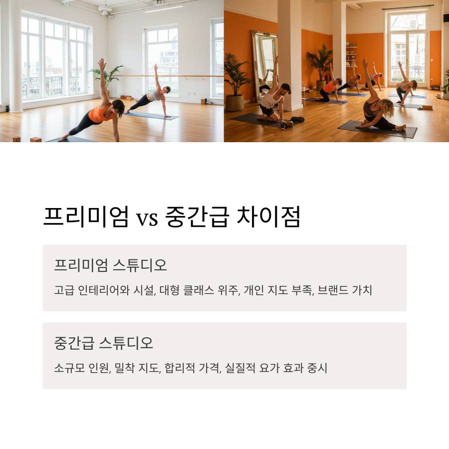 | Q: 프리미엄 스튜디오와 일반 스튜디오의 가장 큰 차이점은? | 시설과 인테리어의 고급스러움, 유명 강사진, 그리고 부가 서비스(타월, 음료 등)의 차이가 가장 크지만, 수업의 질은 반드시 비례하지는 않아요. |