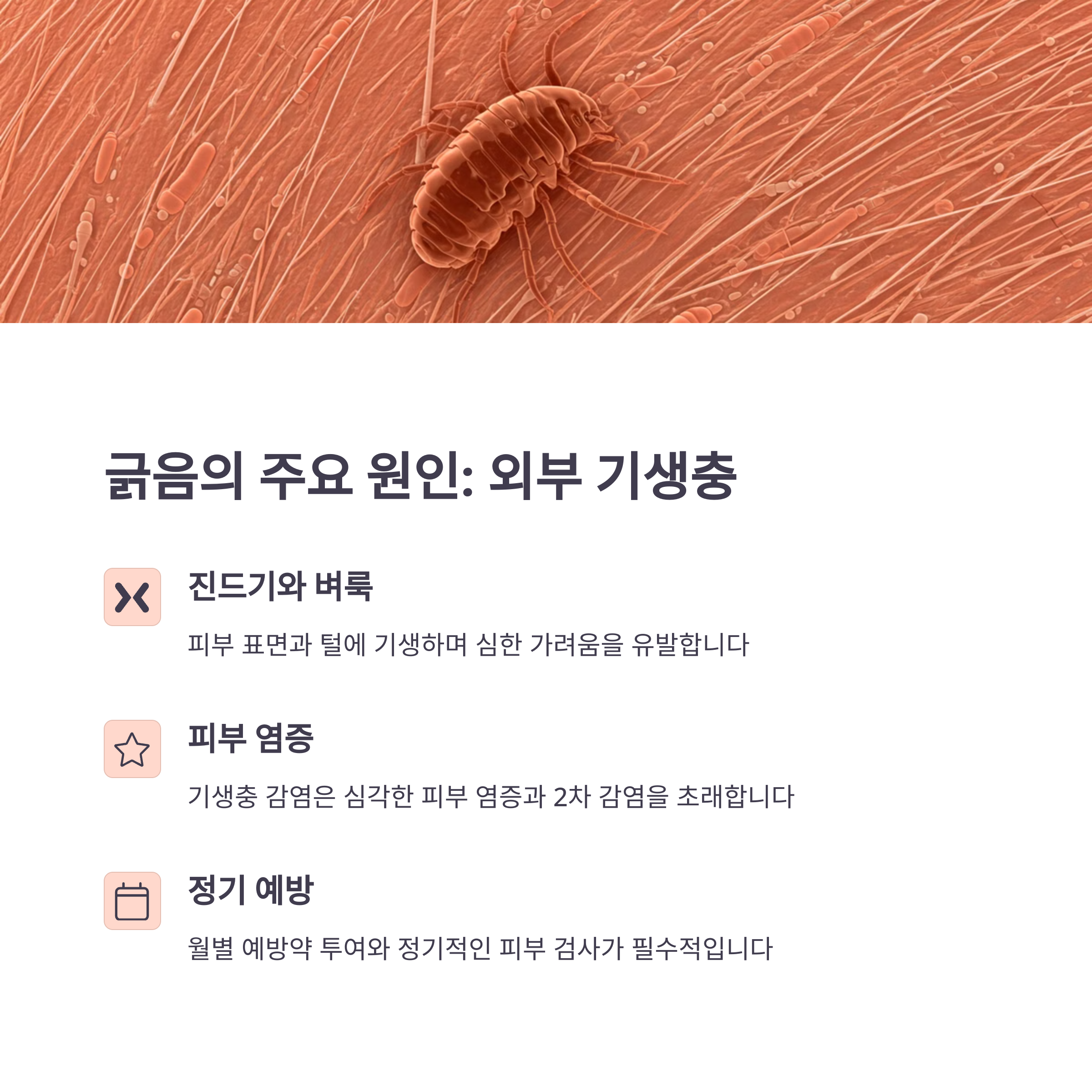 진드기, 벼룩, 모낭충 같은 작은 벌레들이 강아지 피부에 붙어 가려움을 유발할 수 있어요. 특히 따뜻한 계절에는 더 조심해야 해요!