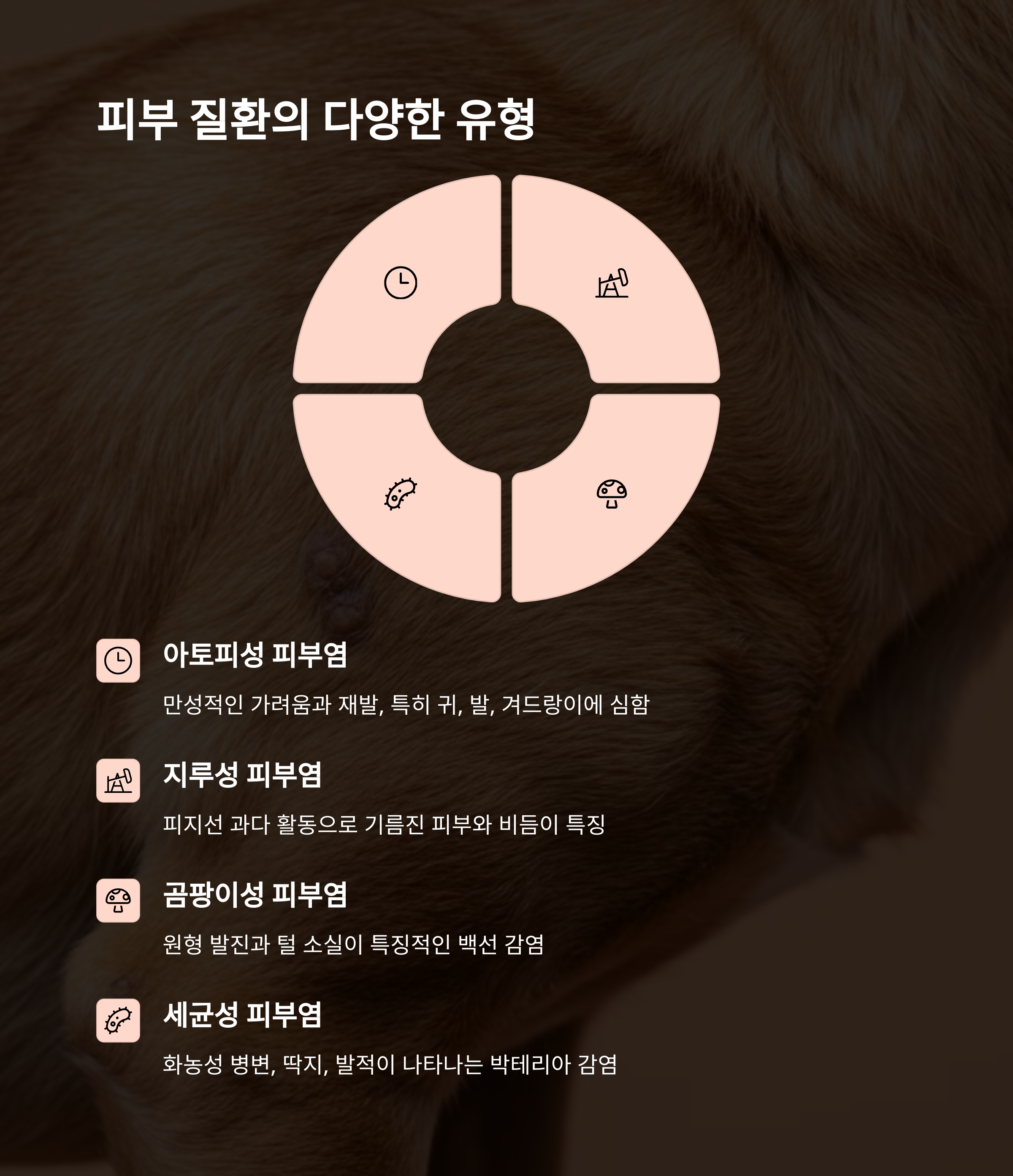 강아지들의 피부 질환은 생각보다 다양하답니다. 아토피성 피부염은 유전적 요인과 환경적 요인이 복합적으로 작용해서 발생해요.