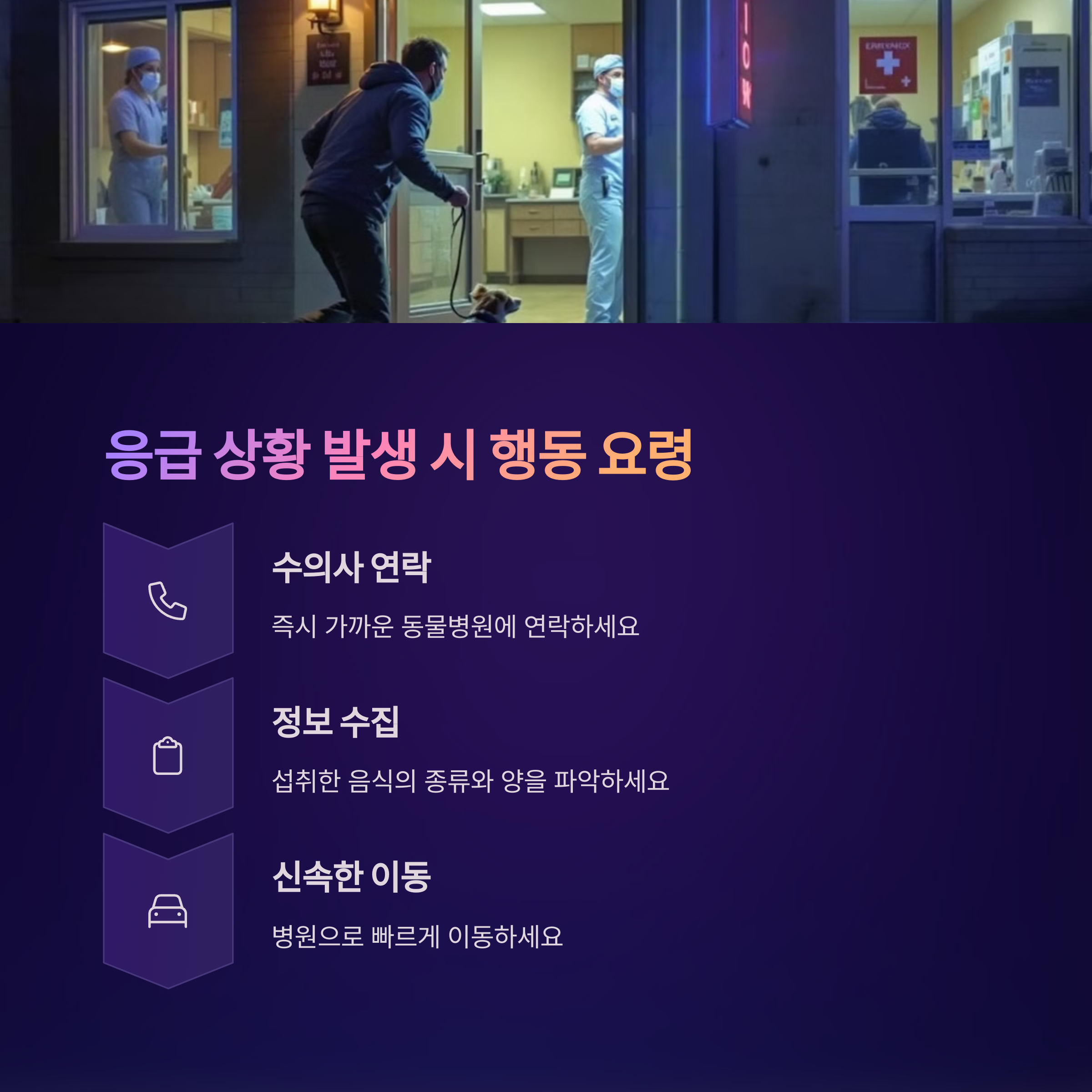 ⏱️ 시간이 중요합니다: 대부분의 식품 독성은 빠른 개입이 예후를 크게 개선합니다. 예를 들어, 초콜릿 섭취 후 1-2시간 내에 적절한 치료를 받으면 대부분의 독소가 흡수되기 전에 제거될 수 있습니다. 미국 동물병원 협회(AAHA)의 연구에 따르면, 중독 사례에서 처음 4시간이 가장 중요한 "골든 타임"입니다.
