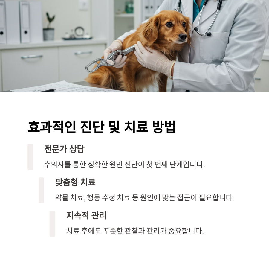 치료 방법은 원인에 따라 달라질 수 있어요. 신체적 문제가 있다면 그에 맞는 약물 치료나 치료법을 제시받을 수 있어요. 행동 문제라면 행동 수정 치료나 심한 경우 항불안제 등의 약물 치료를 병행할 수도 있답니다.