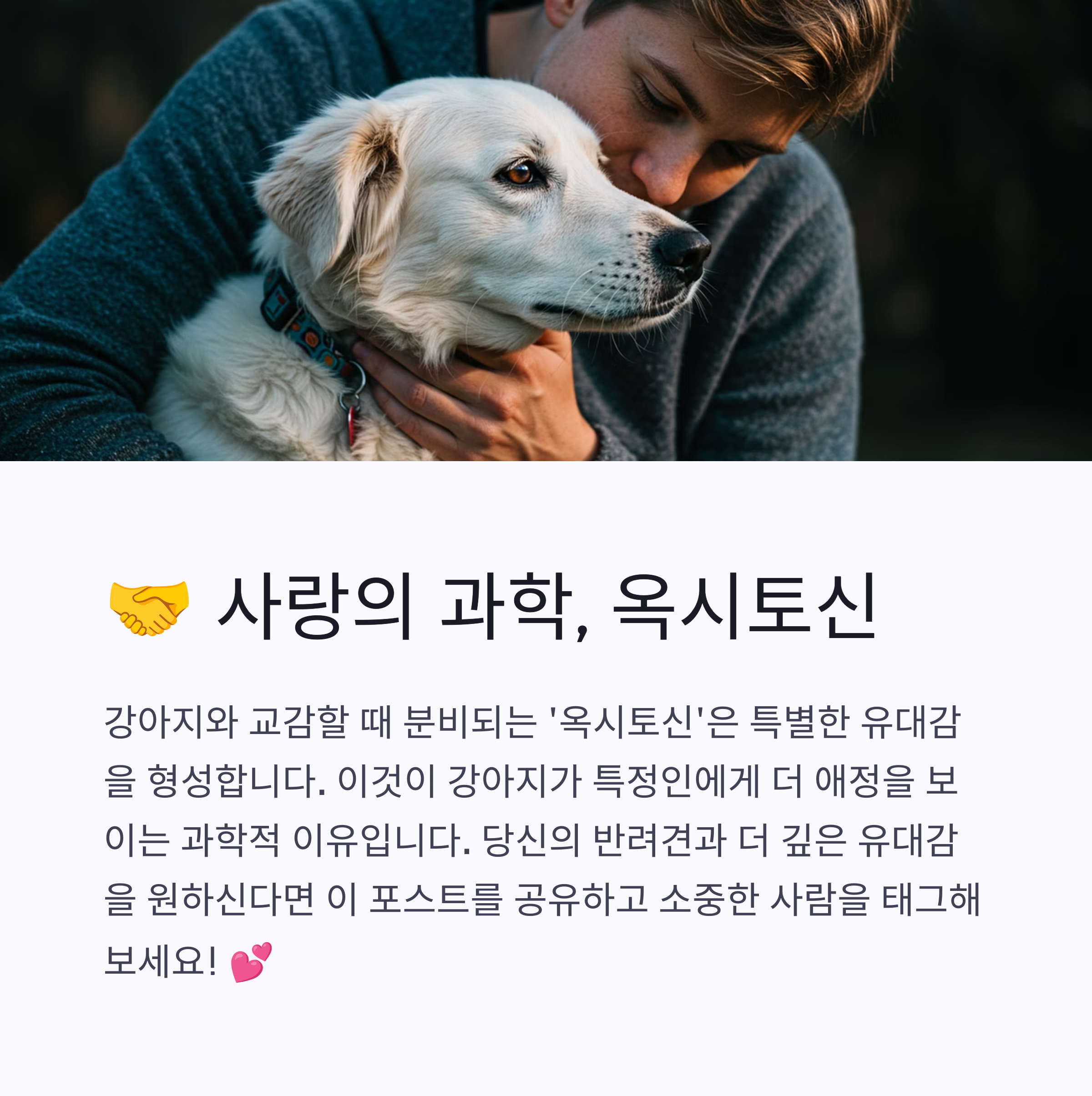 강아지와 사람 사이의 특별한 유대감은 과학적으로도 증명되고 있어요. 서로 교감할 때 분비되는 옥시토신이라는 호르몬이 중요한 역할을 한답니다. 💕