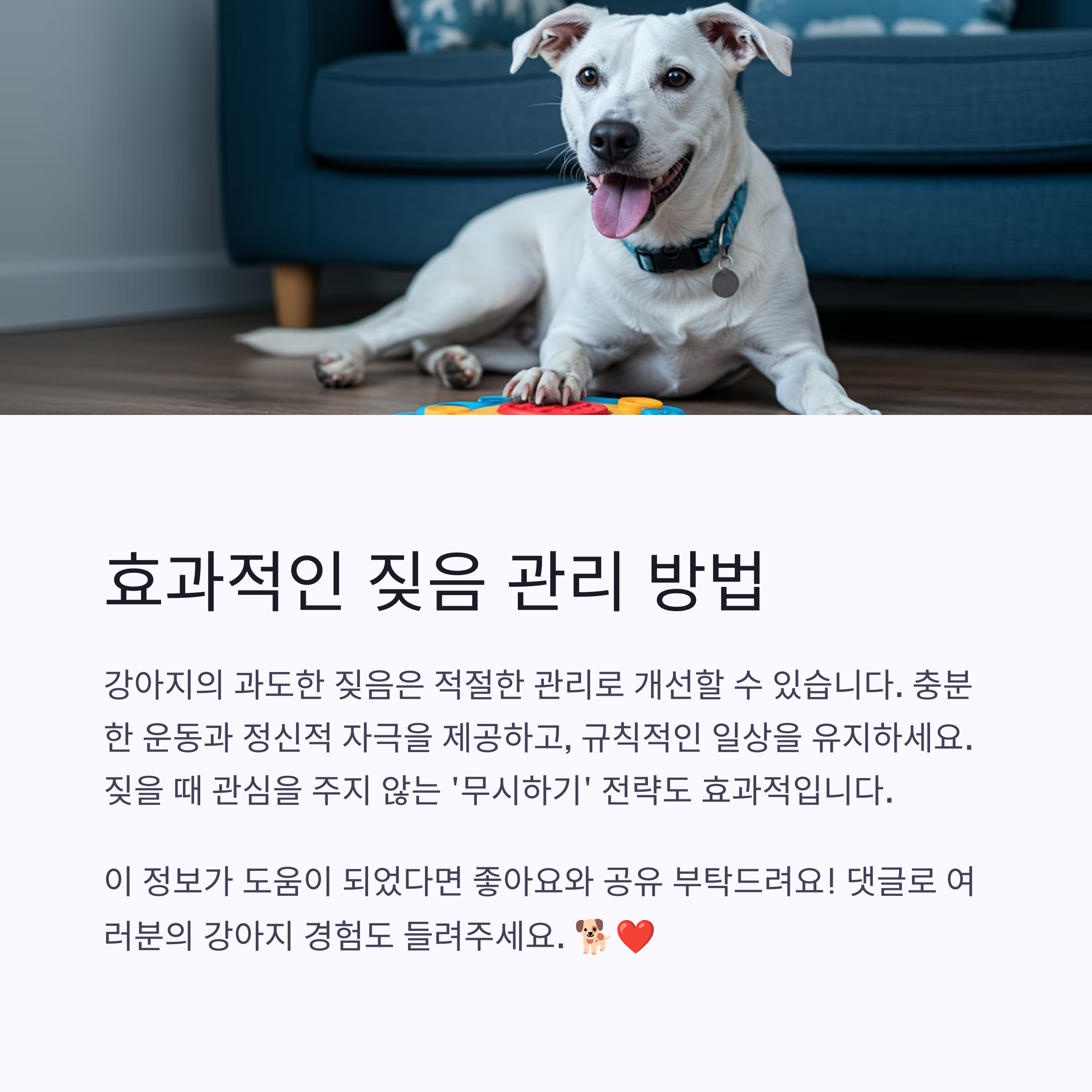 | 낮 시간 짖음 | 지능 발달 장난감, 창문 가림막 설치 | 지루함 해소, 외부 자극 차단 |