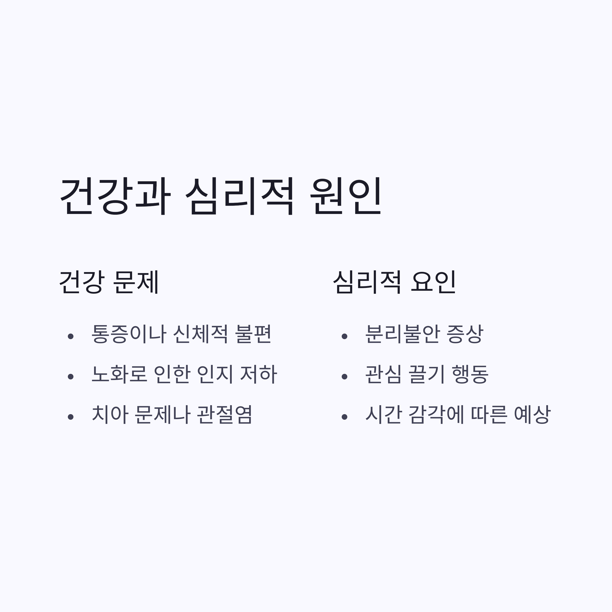 | 노령견 문제 | 편안한 환경, 야간 조명 설치 | 혼란감 감소, 안정감 제공 |