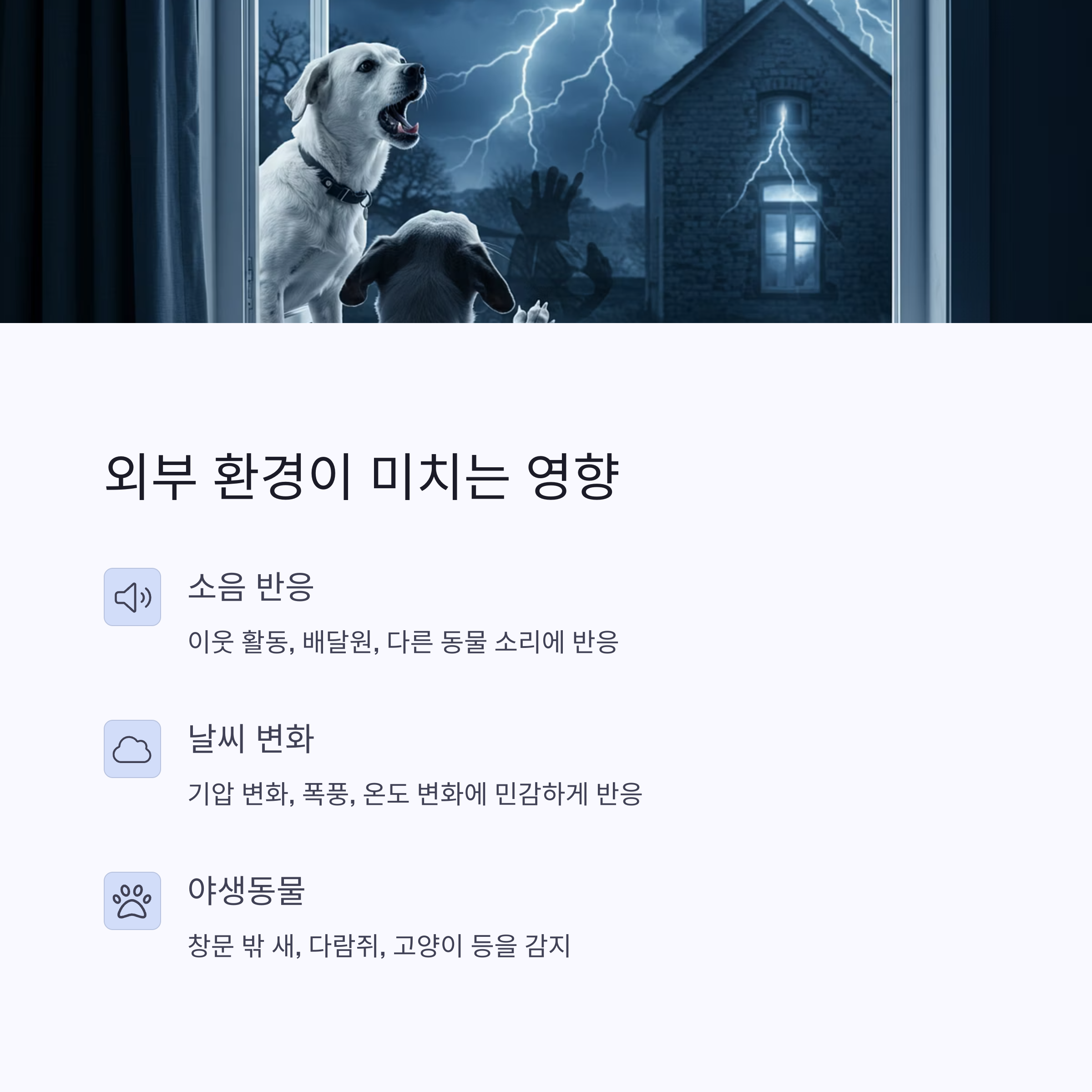 🦊 야생동물의 활동도 원인이 될 수 있어요. 밤이나 새벽에 활동하는 고양이, 너구리 등의 동물이 지나가면 이를 감지하고 짖을 수 있습니다.