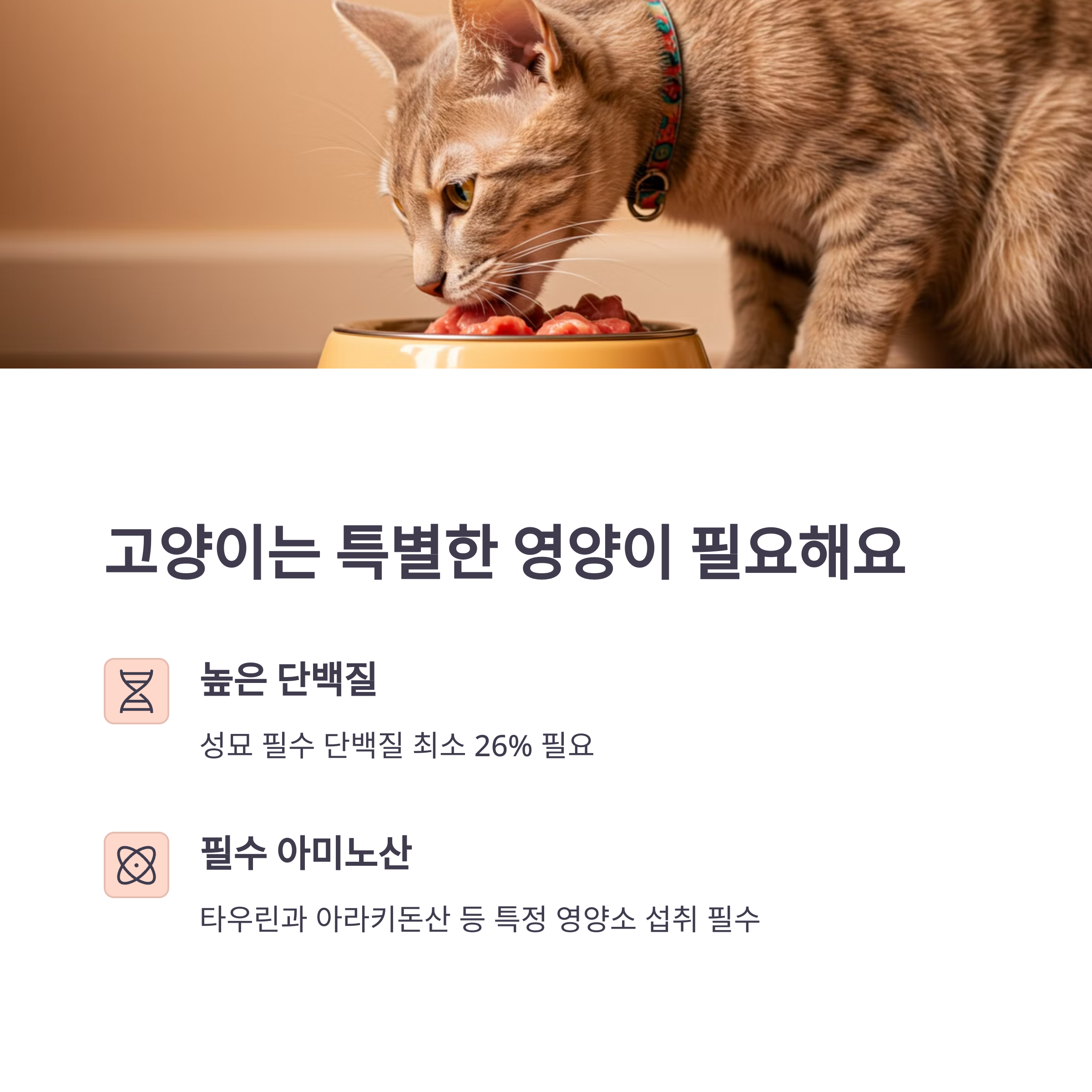 고양이는 강아지와 달리 완전한 육식동물입니다. 그들의 신체는 식물성 단백질을 효율적으로 이용하지 못하며, 필수 아미노산인 타우린을 직접 합성하지 못해요.