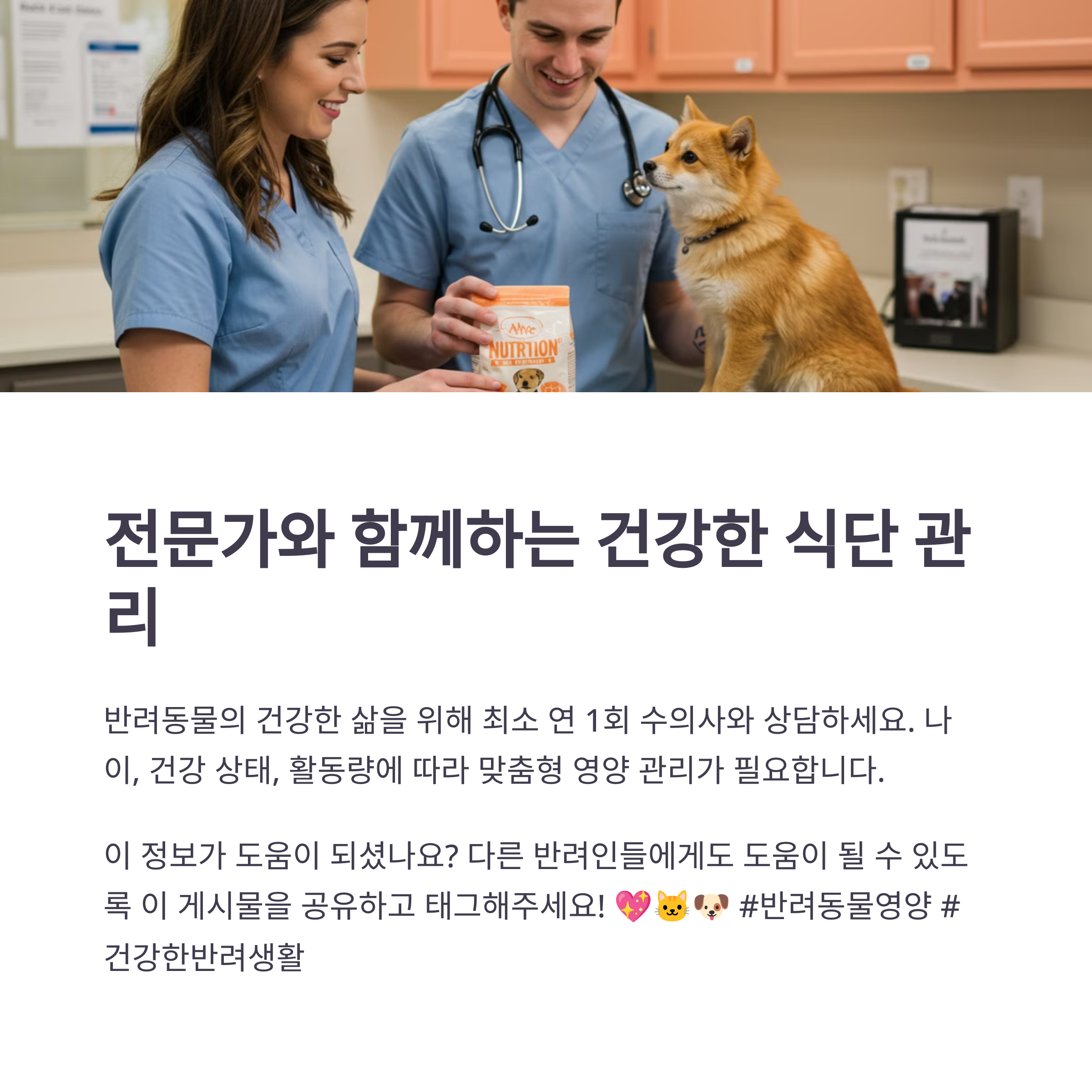 수의사와 정기적인 상담을 통해 반려동물의 개별적인 영양 요구사항을 파악하는 것이 중요합니다. 나이, 활동량, 건강 상태에 따라 맞춤형 식단 조절이 필요해요.