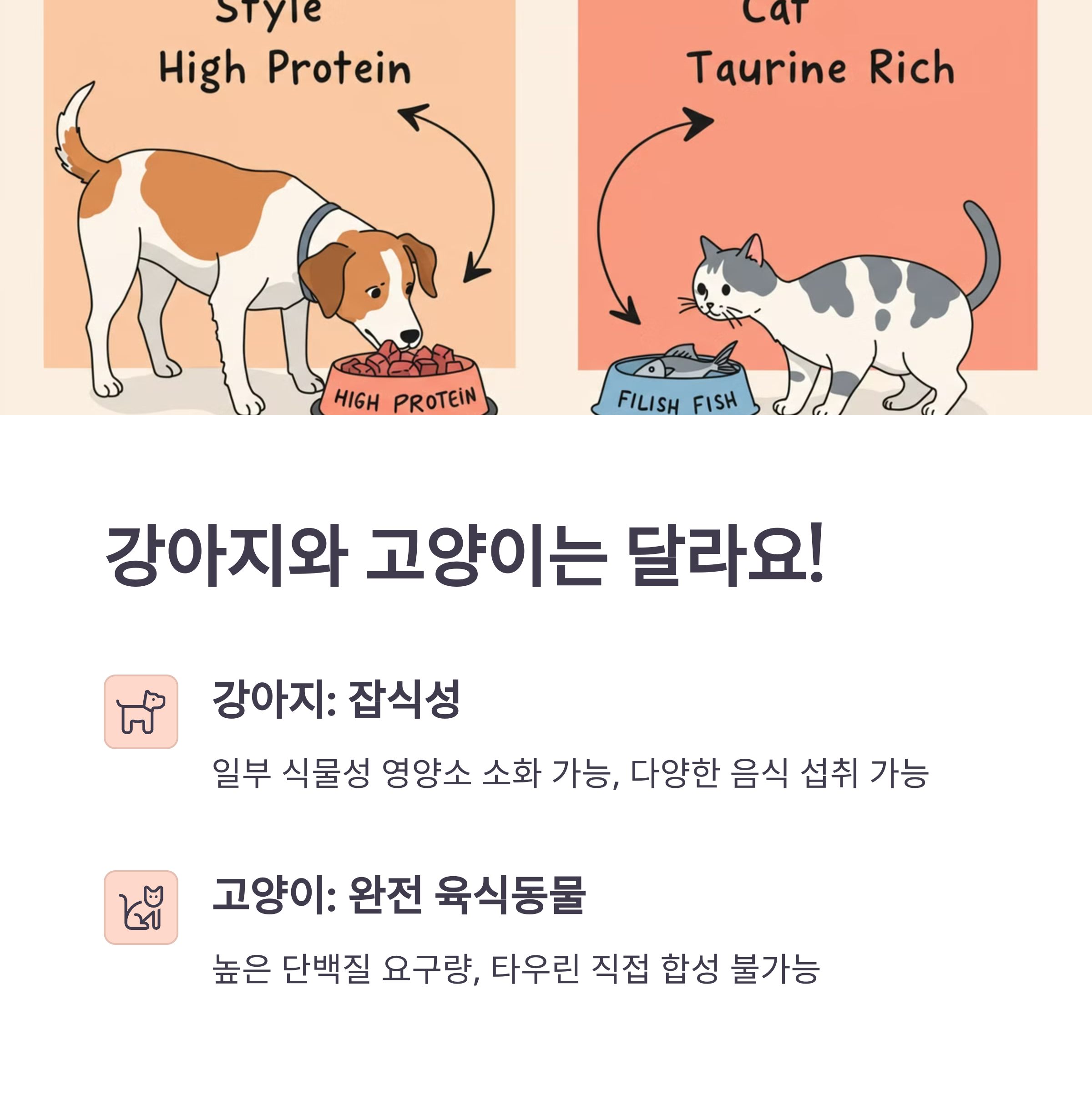 강아지와 고양이는 서로 다른 영양학적 요구사항을 가지고 있어요. 고양이는 필수 아미노산인 타우린이 없으면 심각한 건강 문제가 생길 수 있고, 강아지는 고양이보다 더 다양한 음식을 소화할 수 있습니다.