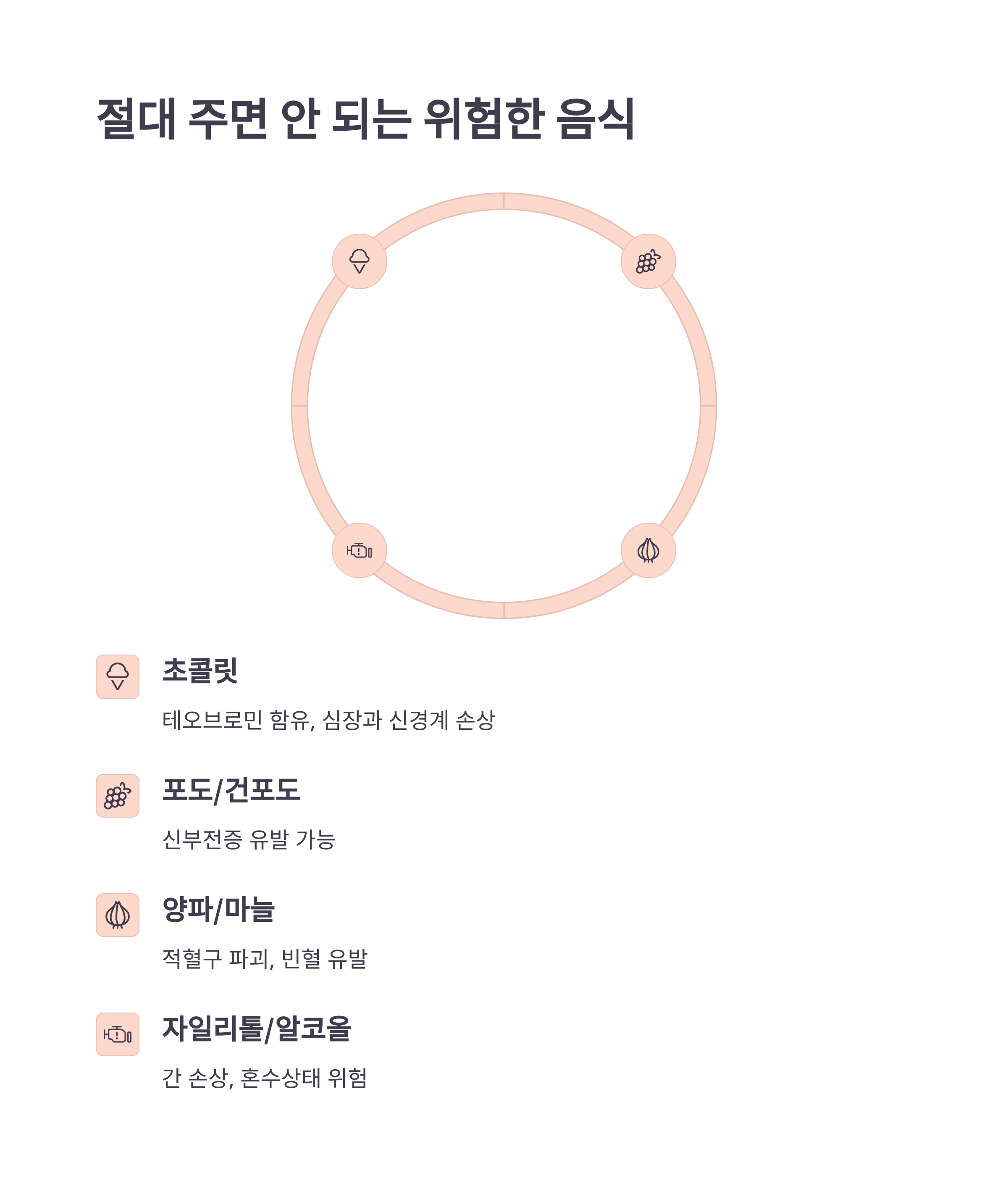 사랑하는 마음에 우리 음식을 나눠주고 싶어도, 반려동물에게 유독한 음식들이 있다는 점을 항상 기억해야 해요. 미국동물학대방지협회에서는 다음 음식들을 주의하라고 권고합니다.