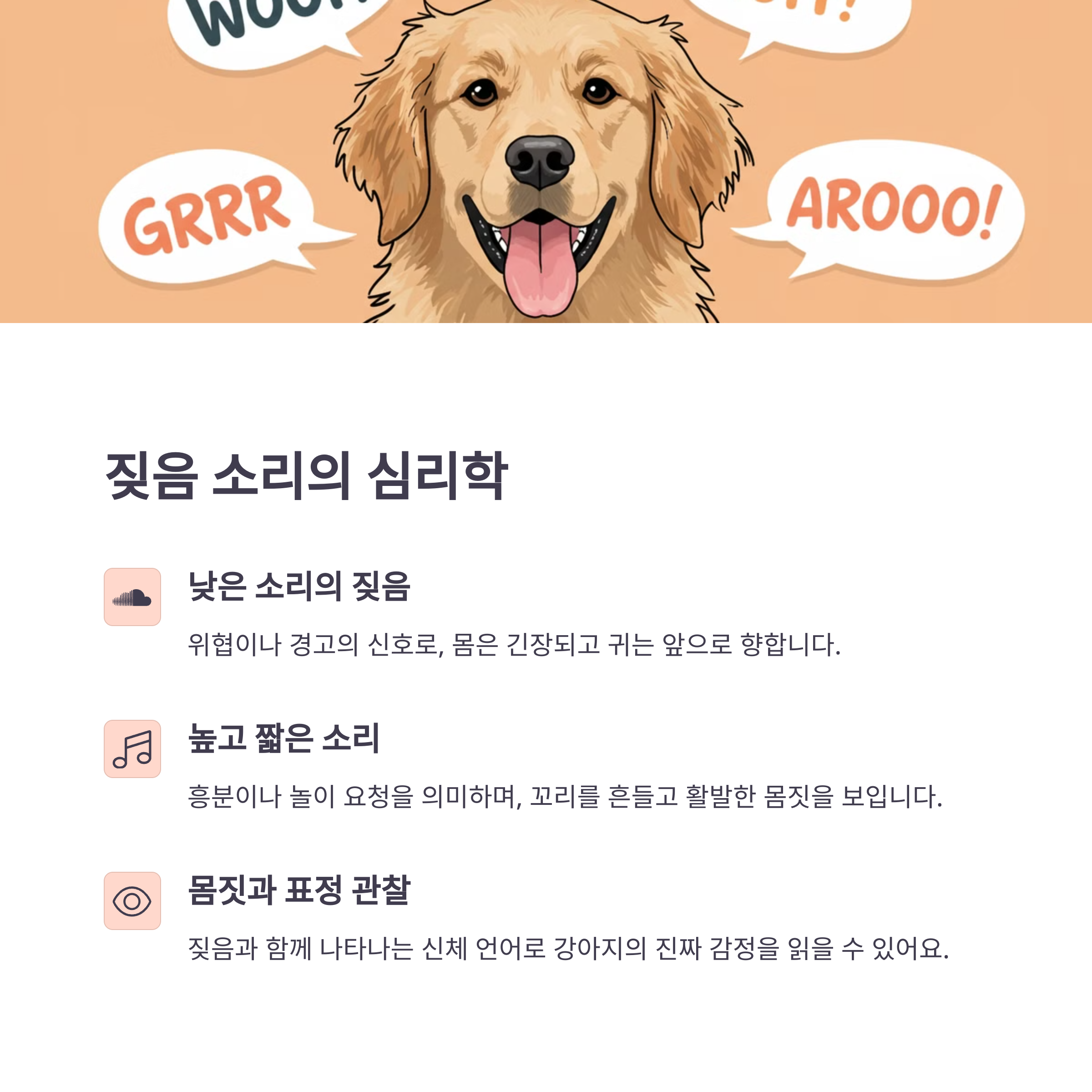반면 높고 짧게 짖는 소리는 놀이를 원하거나 흥분했을 때 내는 경우가 많답니다. 여러분의 강아지는 어떤 소리로 짖나요? 😊
