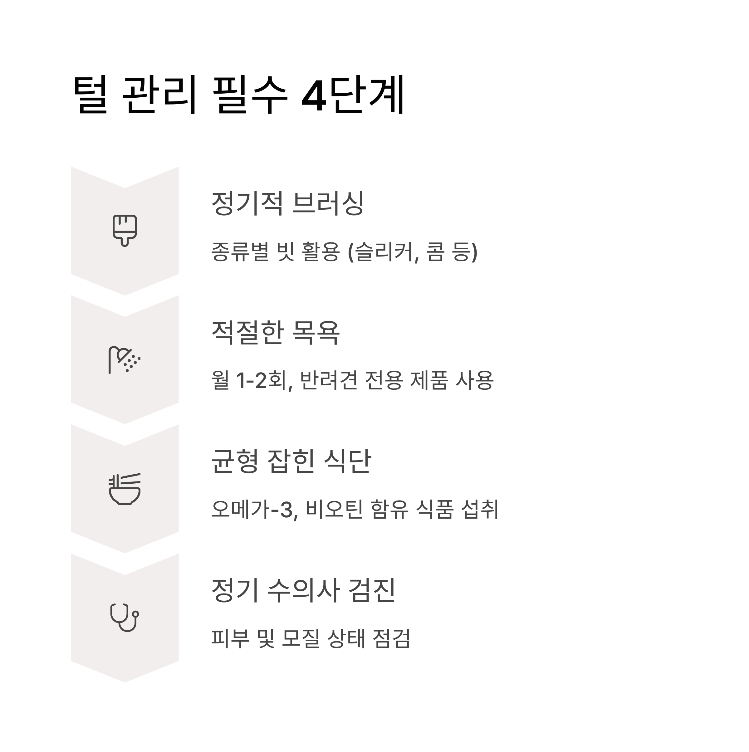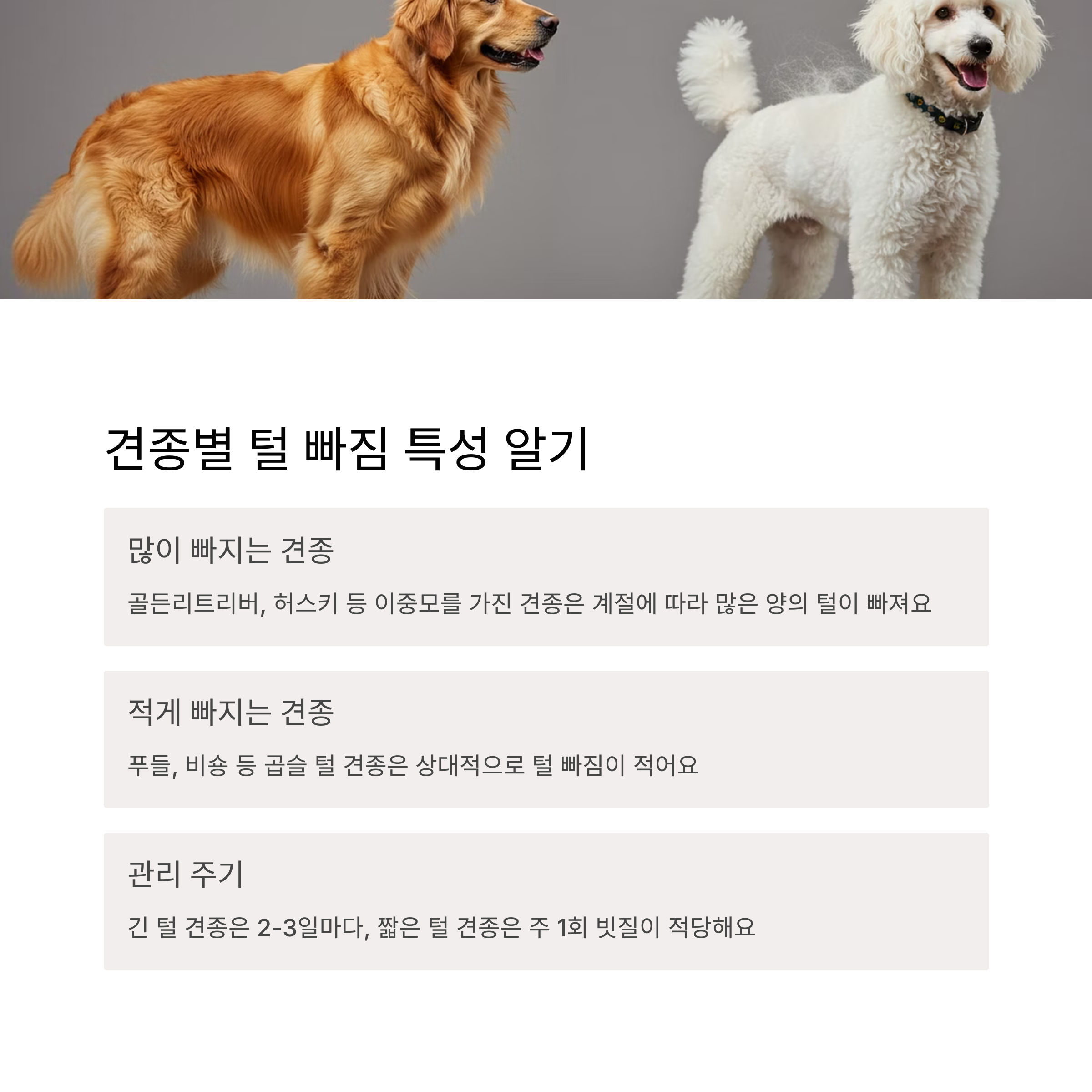 전문 그루밍: 특히 장모종이나 더블코트 견종은 정기적으로 전문 그루머를 방문하는 것이 좋아요. 언더코트 레이킹(속털 제거)은 털갈이 시기에 특히 효과적이에요.