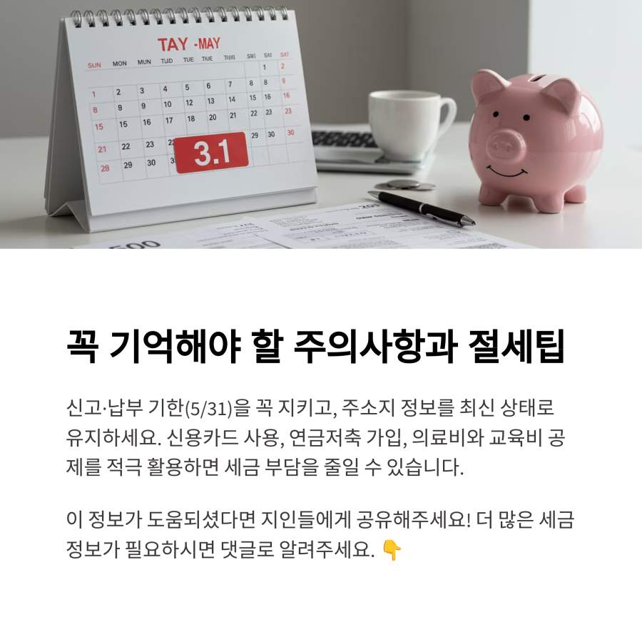 가장 흔한 실수는 납부 기한을 놓치는 것이에요. 매년 5월 31일까지 신고해야 하니 달력에 꼭 표시해두세요. 기한을 넘기면 가산세가 부과될 수 있어요. 😔