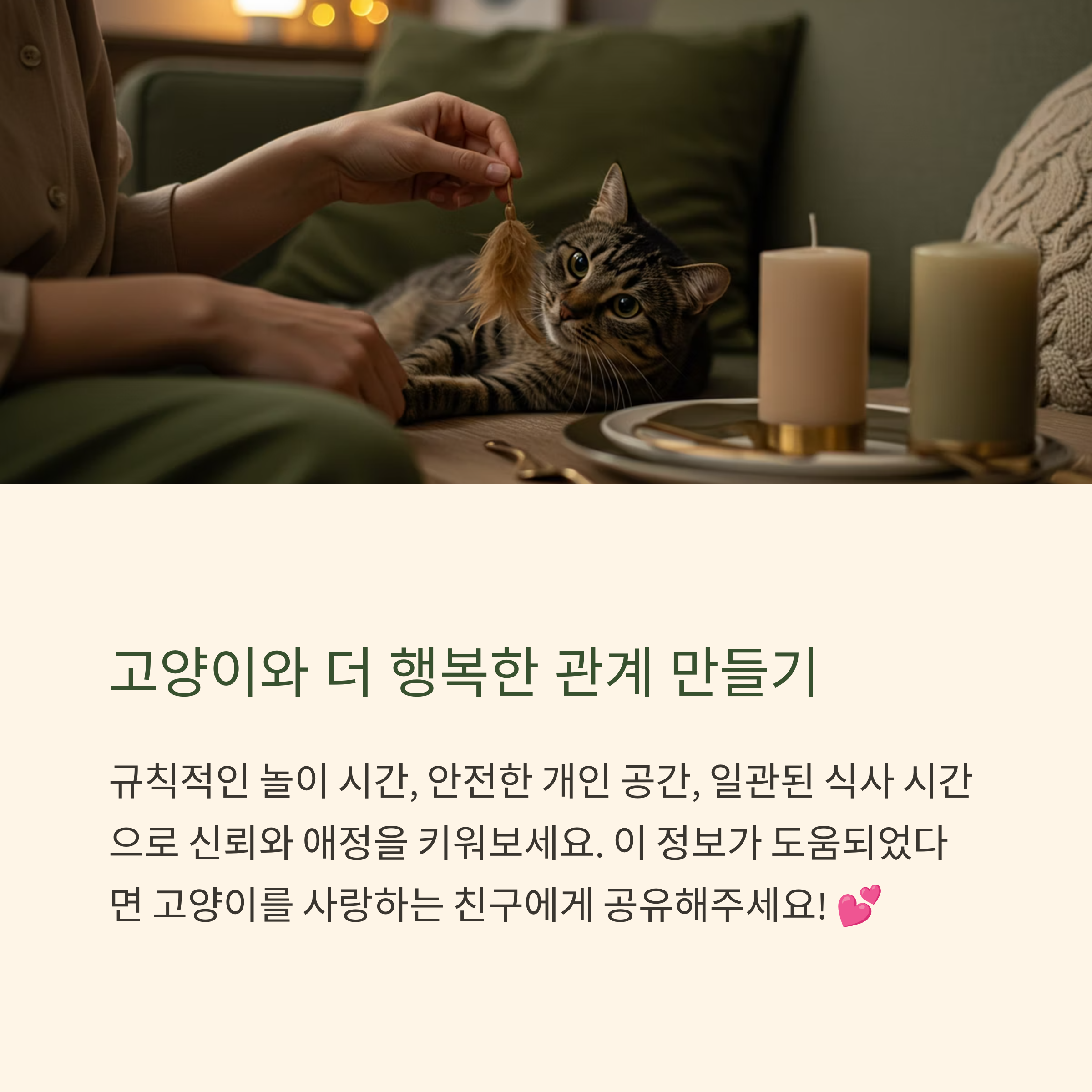 규칙적인 놀이 시간을 가지세요. 하루에 최소 15-20분 정도는 고양이와 적극적으로 놀아주는 것이 좋아요. 이는 고양이의 신체적, 정신적 건강에 매우 중요해요.