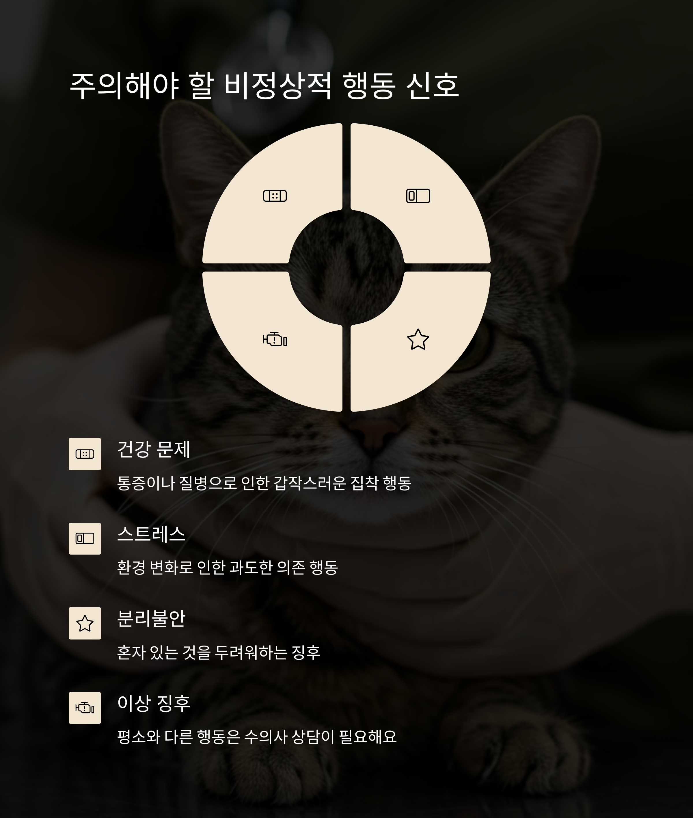 | 과도한 집착 | 건강 문제, 분리불안 | 수의사 상담, 환경 강화 |