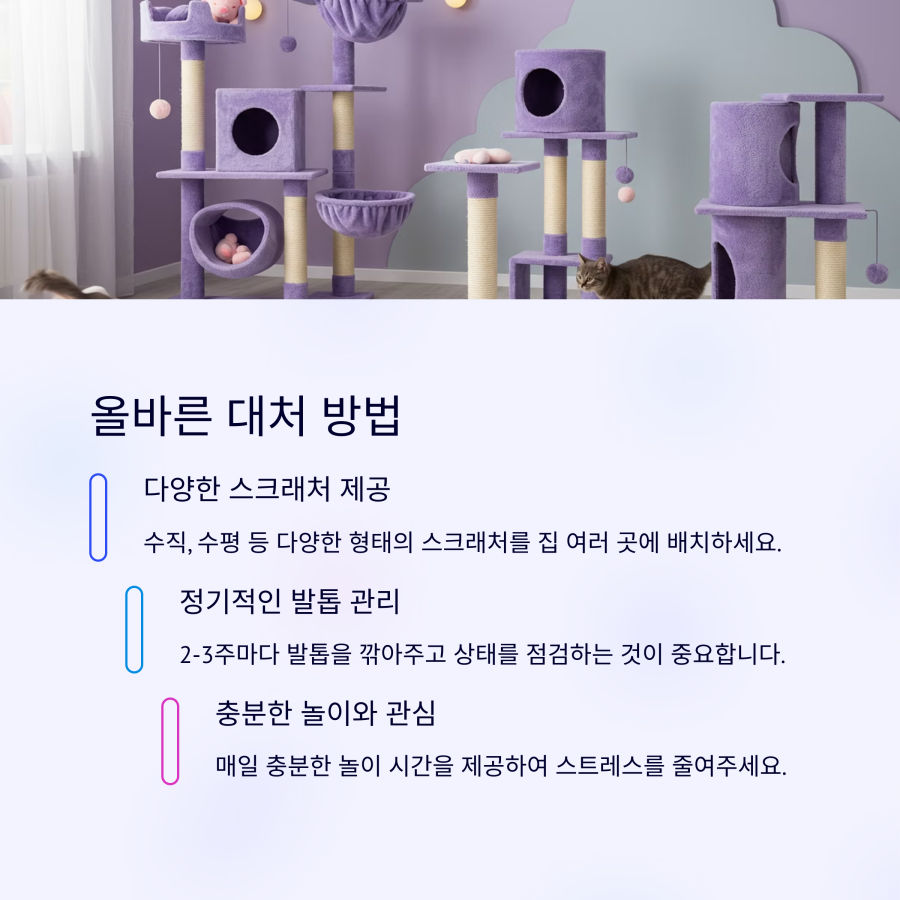 다양한 스크래처를 제공하고, 정기적인 발톱 관리를 해주며, 충분한 놀이와 관심으로 에너지를 발산시켜 주는 것이 중요합니다.
