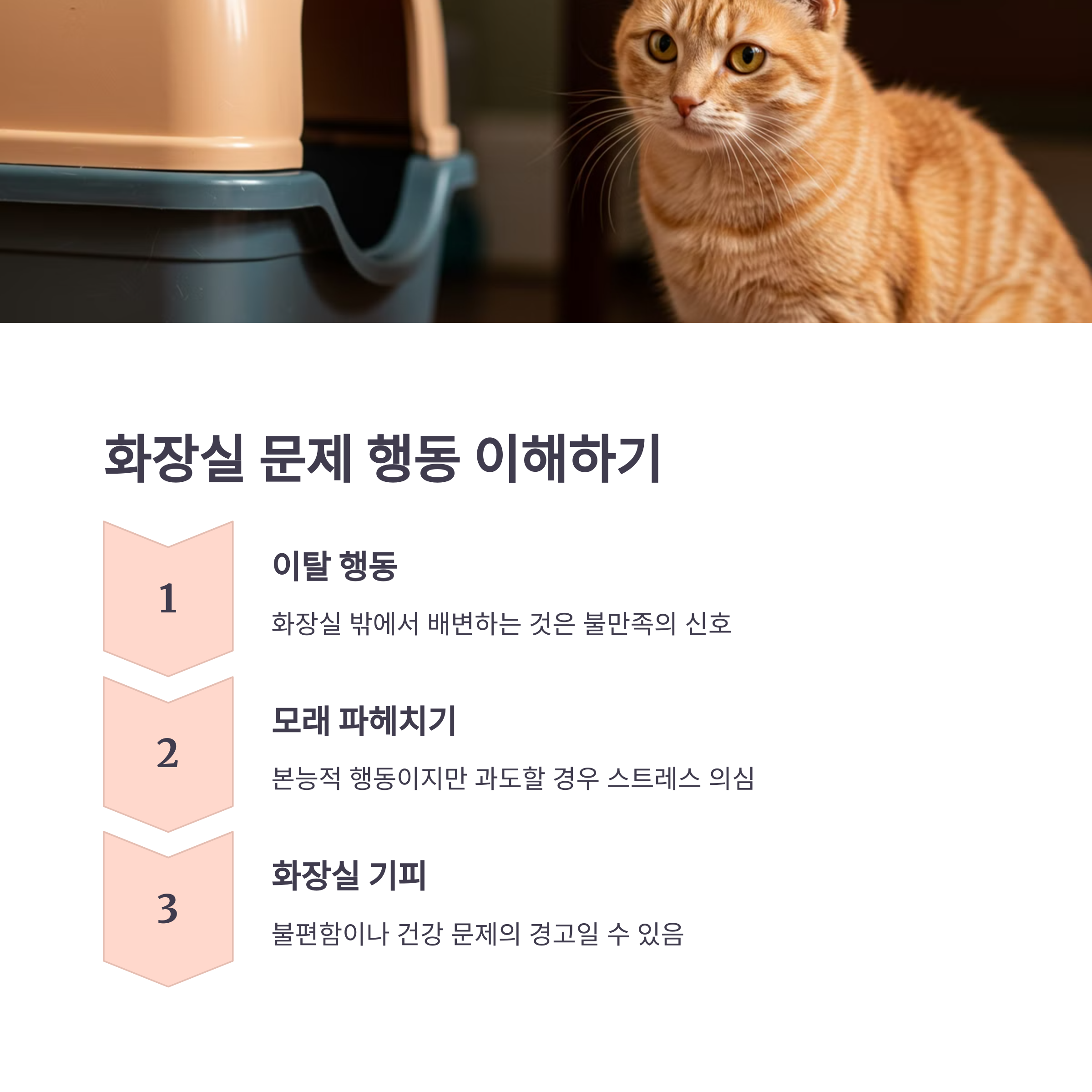| 화장실 기피 | 불편한 위치, 모래 불만족 |