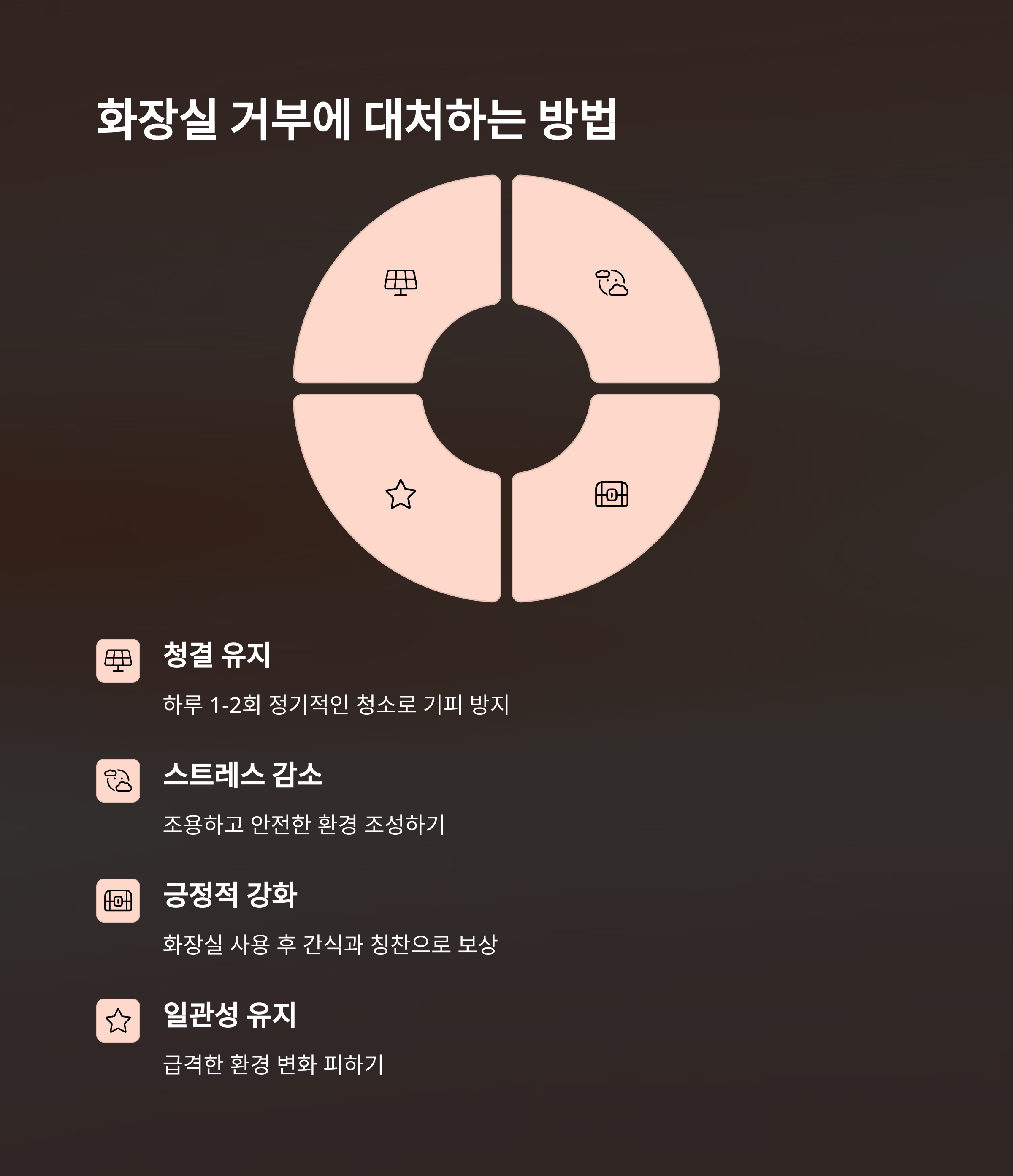 해결책으로는 점진적인 훈련과 긍정적인 강화가 효과적이에요. 화장실 사용 후 간식이나 칭찬으로 보상해주면 좋은 습관을 형성하는 데 도움이 됩니다. 🍬