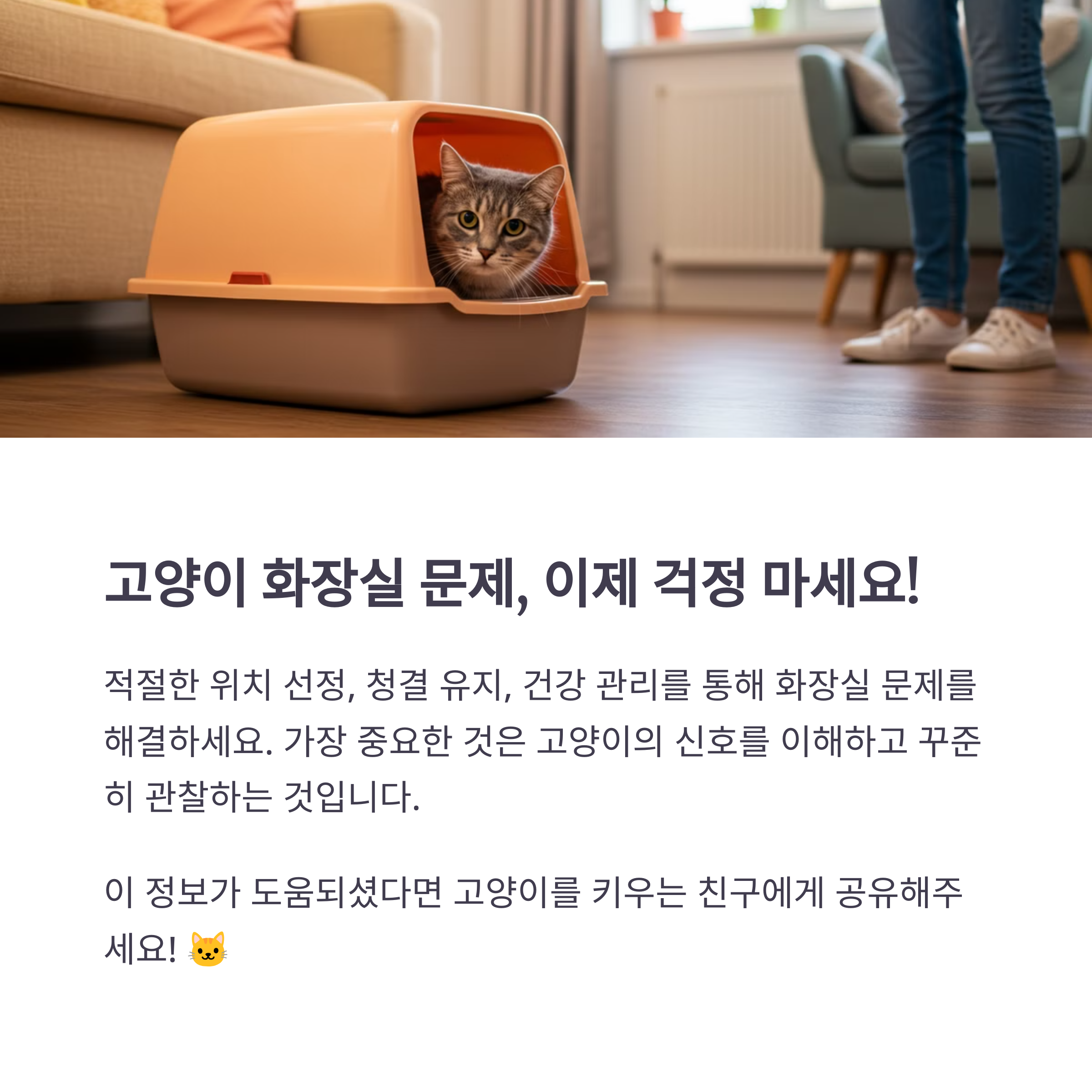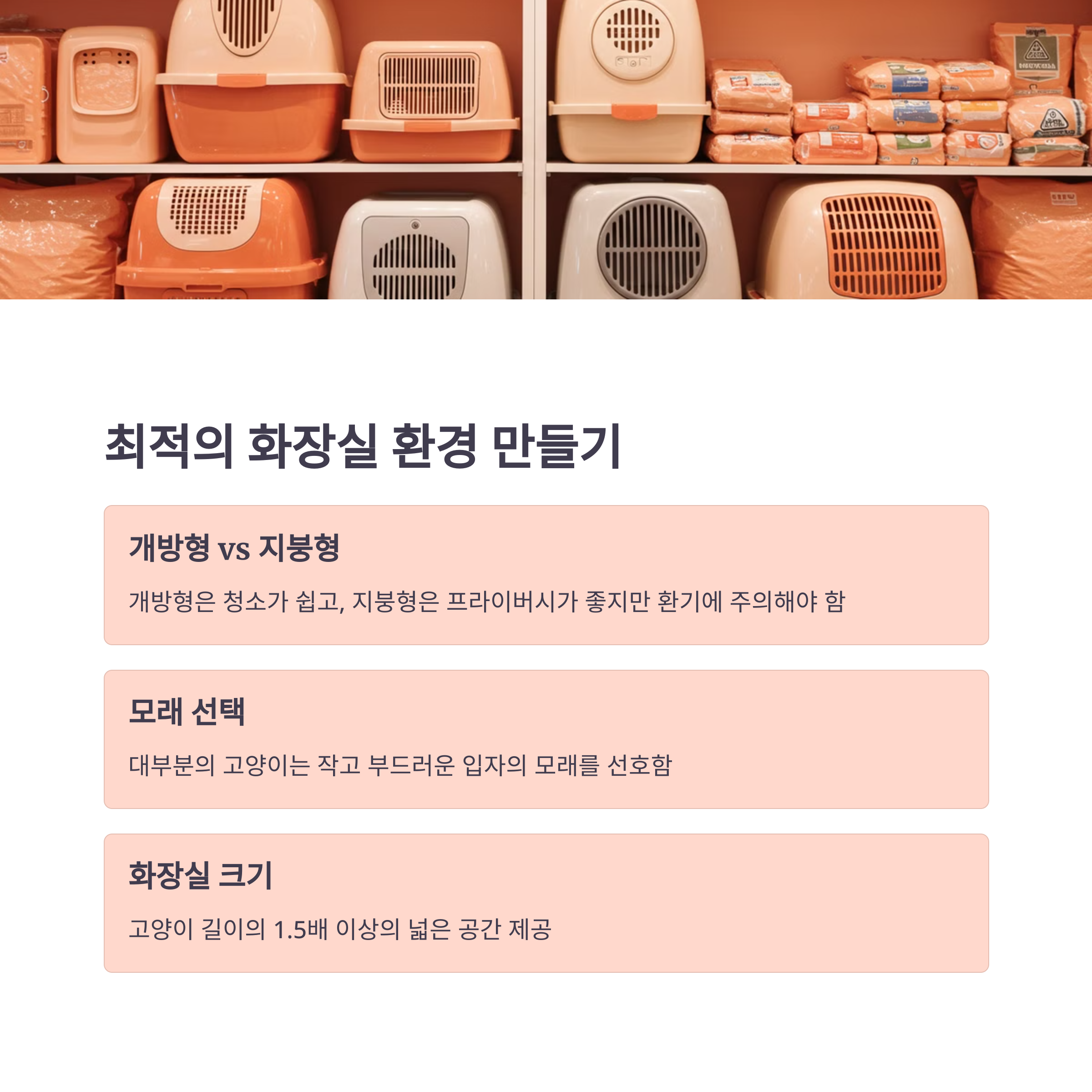 고양이마다 선호하는 화장실 유형이 다를 수 있어요. 개방형 화장실과 지붕이 있는 화장실 중 무엇이 우리 고양이에게 맞는지 관찰해보세요. 😸