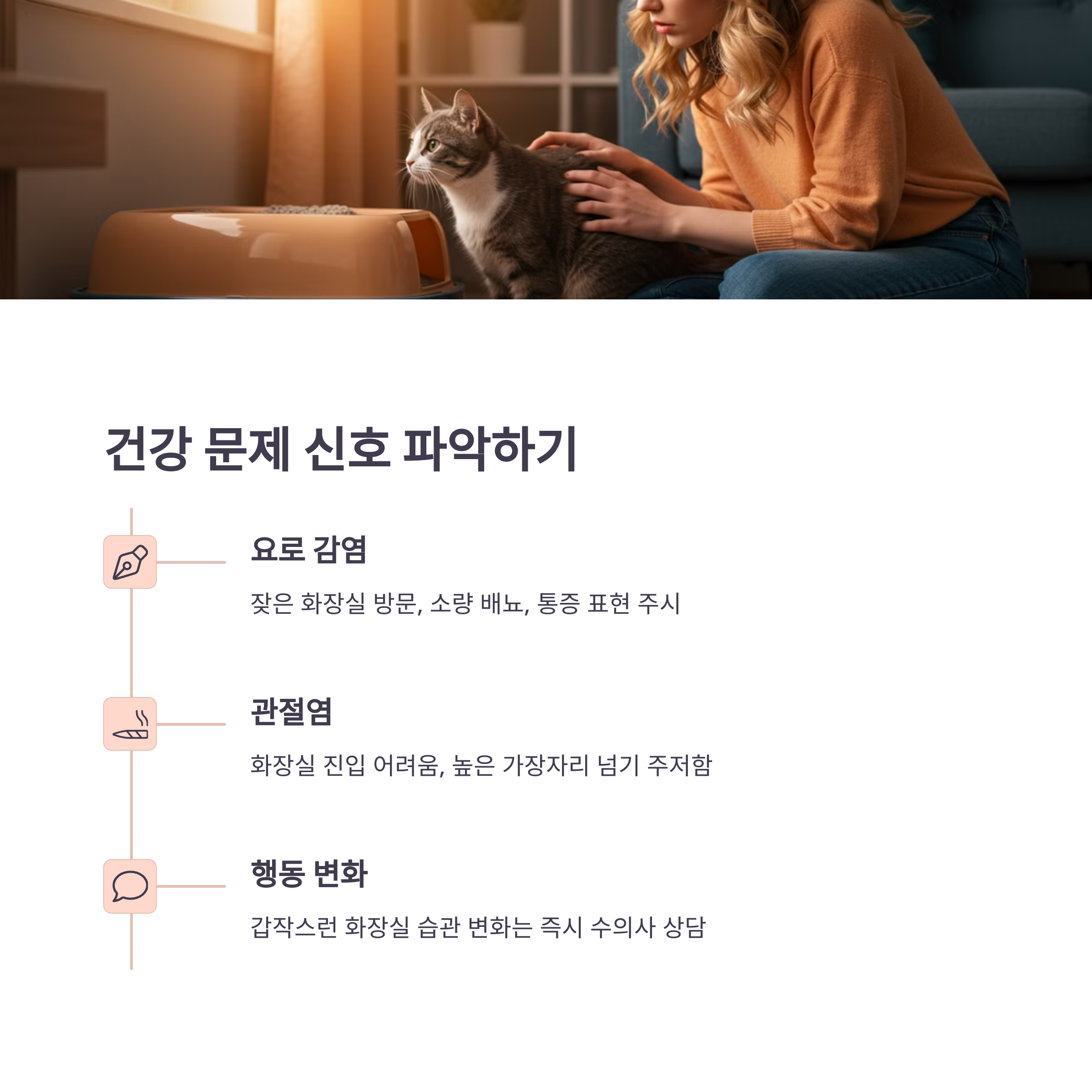 고양이의 화장실 문제가 갑자기 시작되거나 행동 변화가 뚜렷하다면, 건강 문제를 의심해볼 필요가 있어요. 특히 요로 감염, 방광염, 결석 등의 문제는 화장실 행동에 큰 영향을 미칠 수 있어요. 🏥