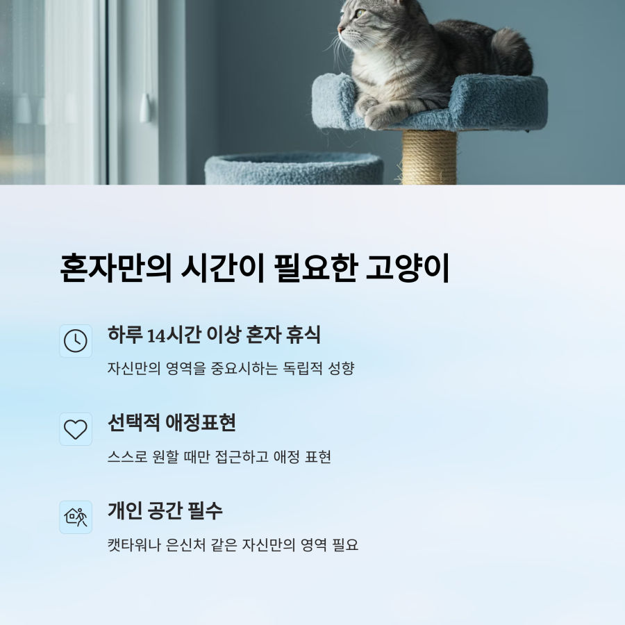 고양이는 본질적으로 독립적인 동물이에요. 혼자서도 잘 지내며 자신만의 시간과 공간을 중요하게 생각해요.
