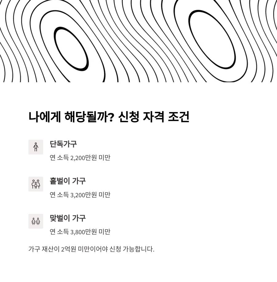먼저 가구 유형별 소득 요건이 다르니 본인이 어디에 해당하는지 확인해 보세요!