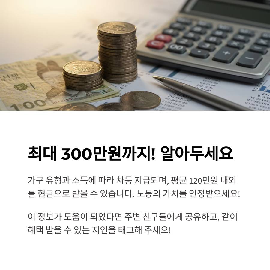 | 지급액은 얼마인가요? | 가구 유형과 소득에 따라 다르며 최대 300만원 |