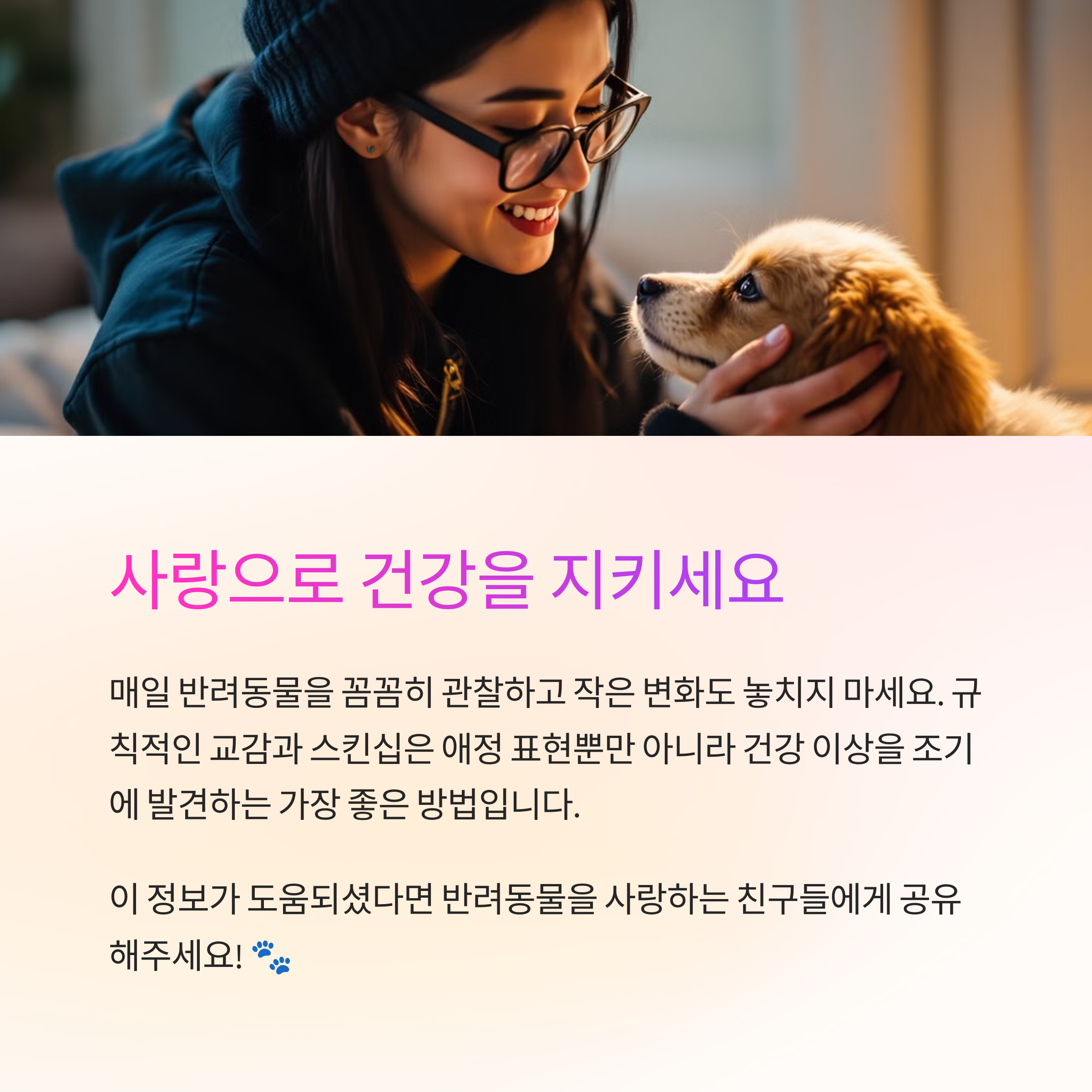 매일 반려동물의 작은 변화도 놓치지 않도록 세심하게 관찰해주세요. 초기에 발견하는 것이 질병 예방의 첫걸음이랍니다.