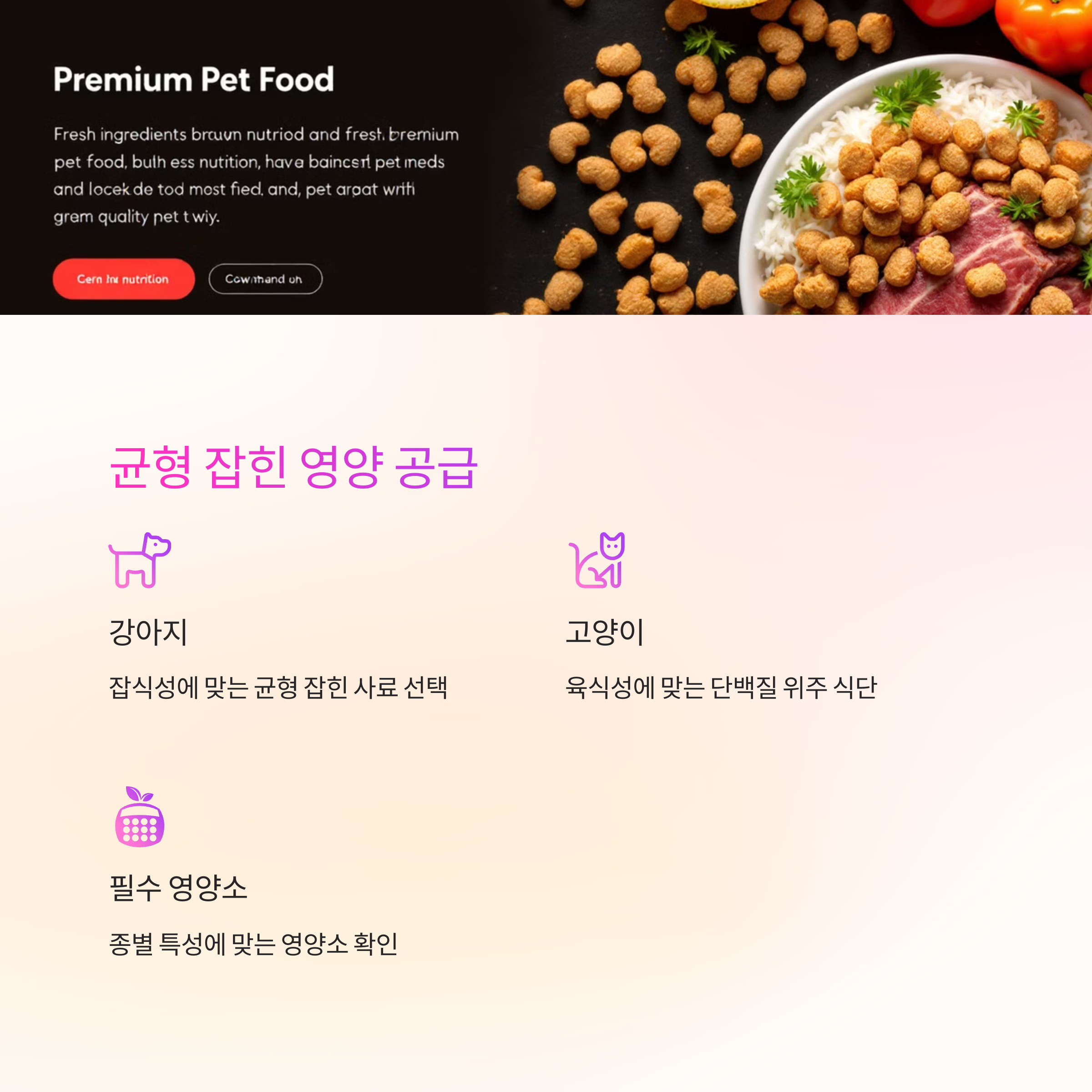 | 강아지와 고양이에게 같은 사료를 줘도 될까요? | 안 됩니다. 고양이는 필수 영양소인 타우린이 더 많이 필요하고, 강아지는 다른 영양 균형이 필요해요. 각자에게 맞는 사료를 선택해주세요. |