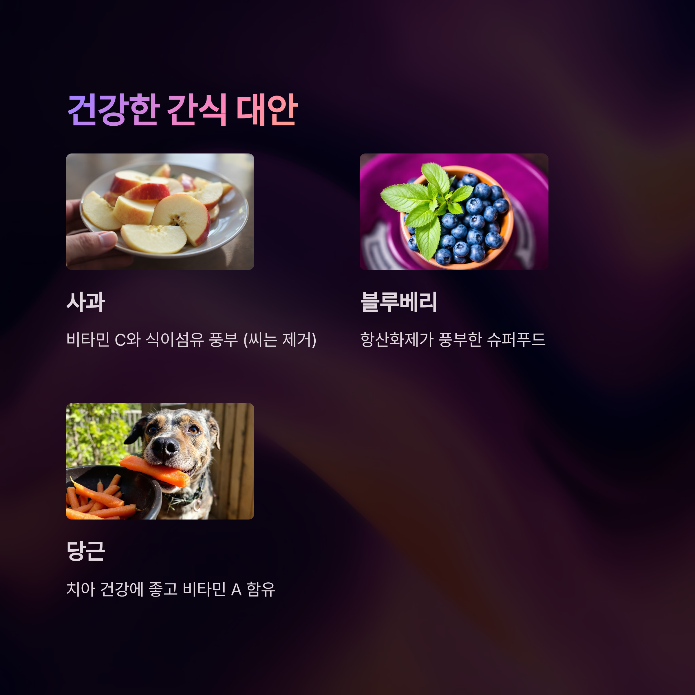 그렇다면 우리 강아지에게 달콤한 간식 대신 어떤 건강한 간식을 줄 수 있을까요?