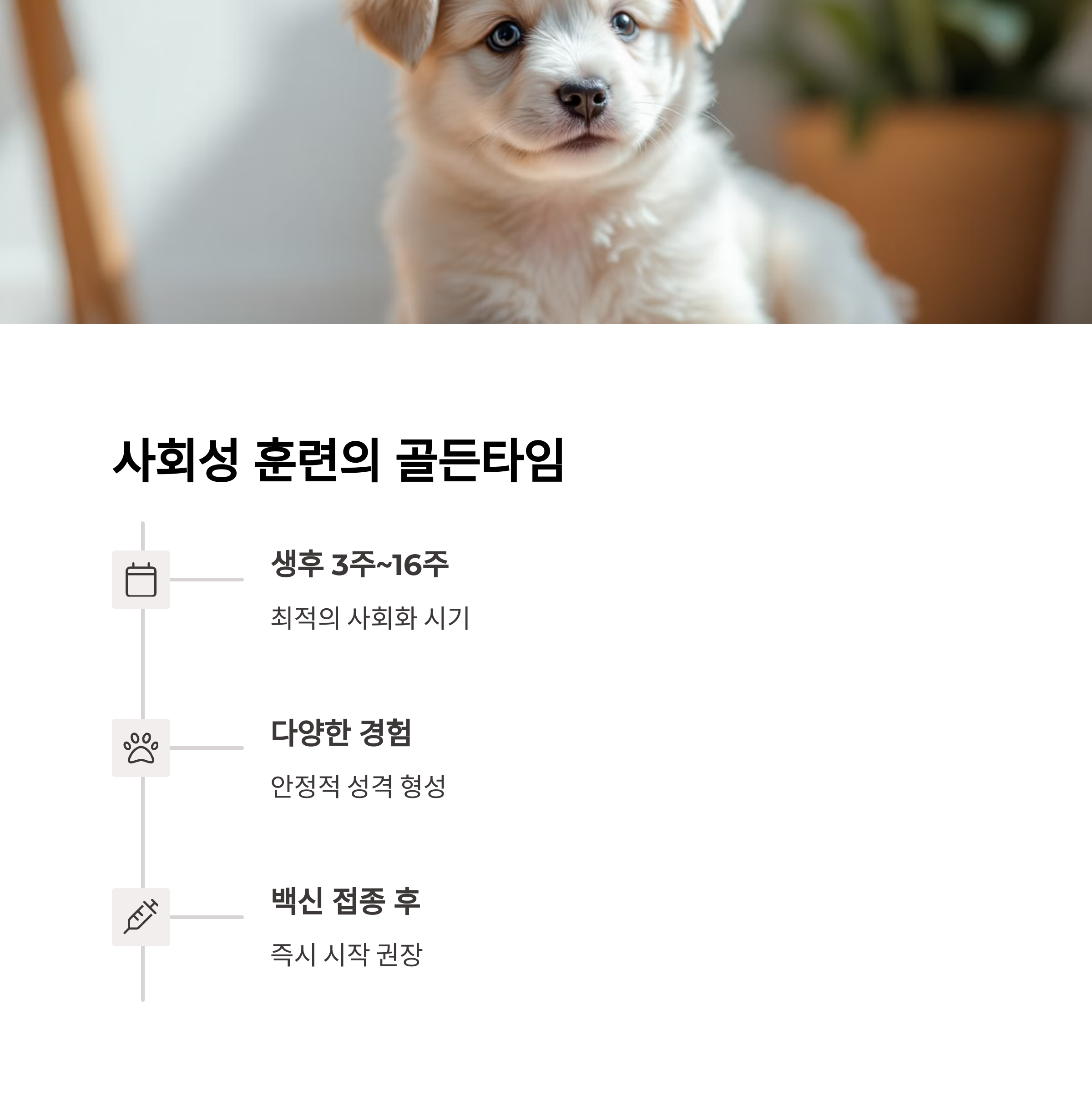 | 생후 3~16주 사이가 골든타임 | 조용한 공원부터 시작하기 |