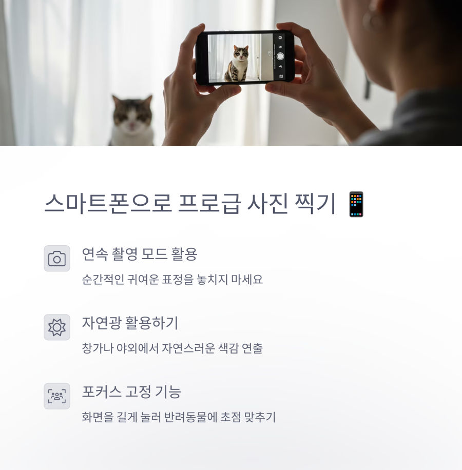 스마트폰으로 촬영할 때는 연속 촬영 모드를 활용하세요. 반려동물은 예측할 수 없게 움직이므로 연속 촬영으로 여러 장을 찍은 후 좋은 컷을 고르는 방법이 효과적이에요.