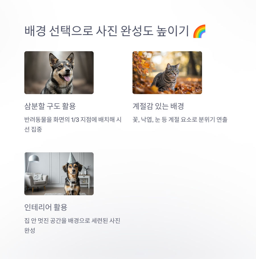 | 반려동물 사진 촬영의 중요성 | 필요한 장비와 준비물 |