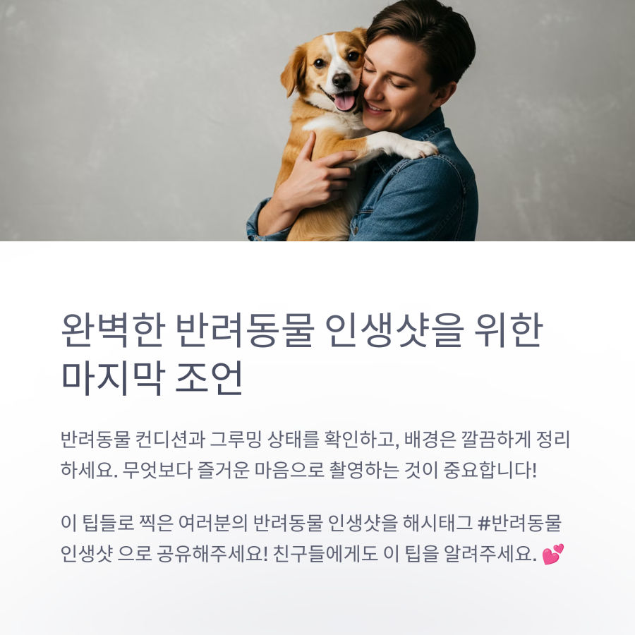 마지막으로, 즐겁게 촬영하는 것이 가장 중요해요! 반려동물도 여러분의 감정을 느낄 수 있으니, 즐거운 마음으로 촬영하면 더 좋은 결과를 얻을 수 있답니다.