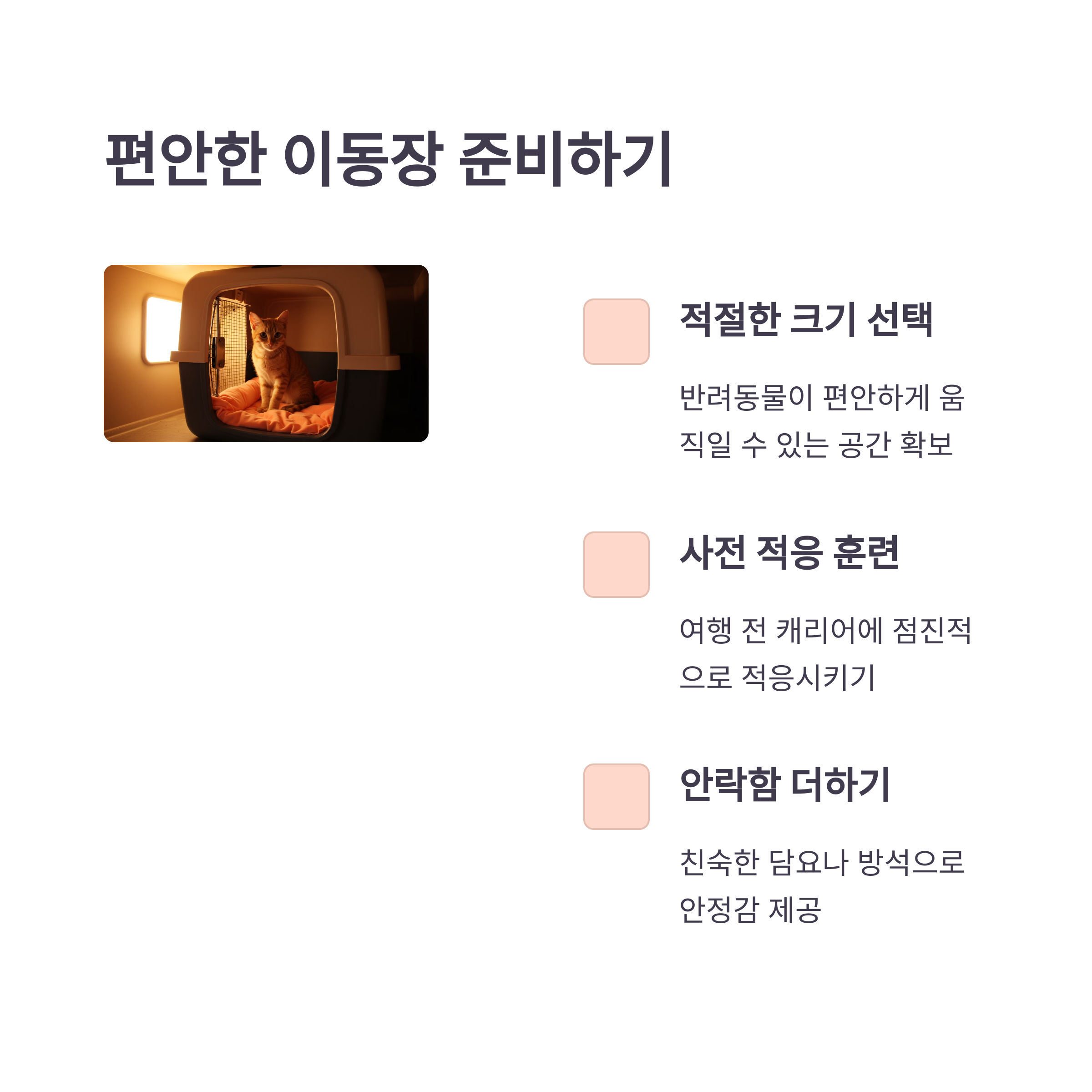 | 고양이는 환경 변화에 민감하므로 익숙한 냄새가 있는 담요나 장난감을 가져가세요. 휴대용 화장실과 모래, 그리고 스크래쳐도 준비하면 좋습니다. 이동 중에는 캐리어를 어둡게 해주는 것이 스트레스 감소에 도움이 됩니다. |