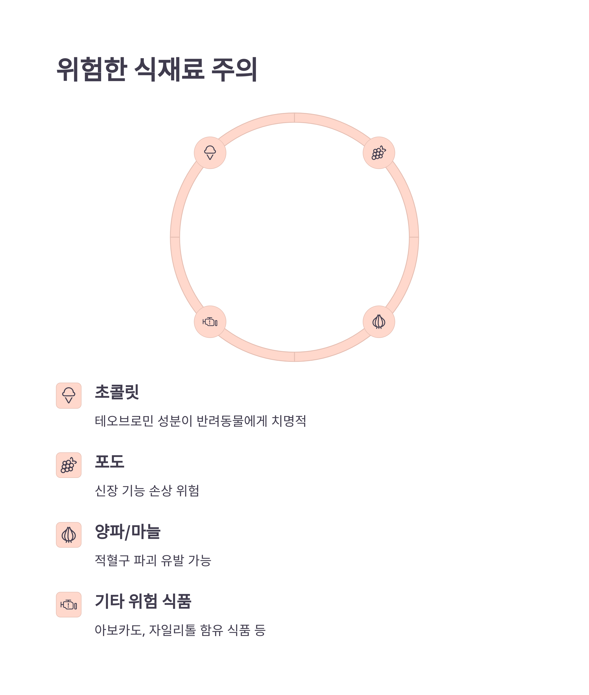 절대 주지 말아야 할 식품으로는 초콜릿, 포도, 건포도, 양파, 마늘, 아보카도 등이 있으니 주의하세요! 🚫