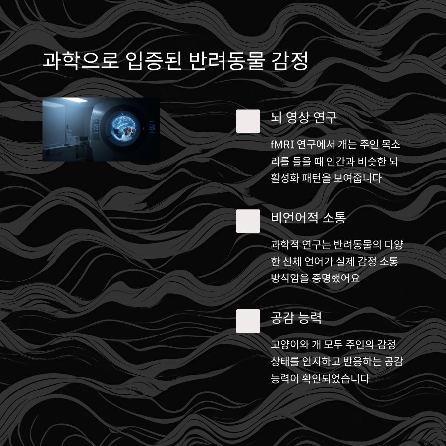 놀랍게도 개와 고양이를 포함한 포유류 반려동물들도 이와 유사한 뇌 구조를 가지고 있어요! 최근 신경과학 연구에 따르면, 반려동물들의 뇌에서도 감정을 처리하는 영역이 활성화되는 것이 확인되었습니다.