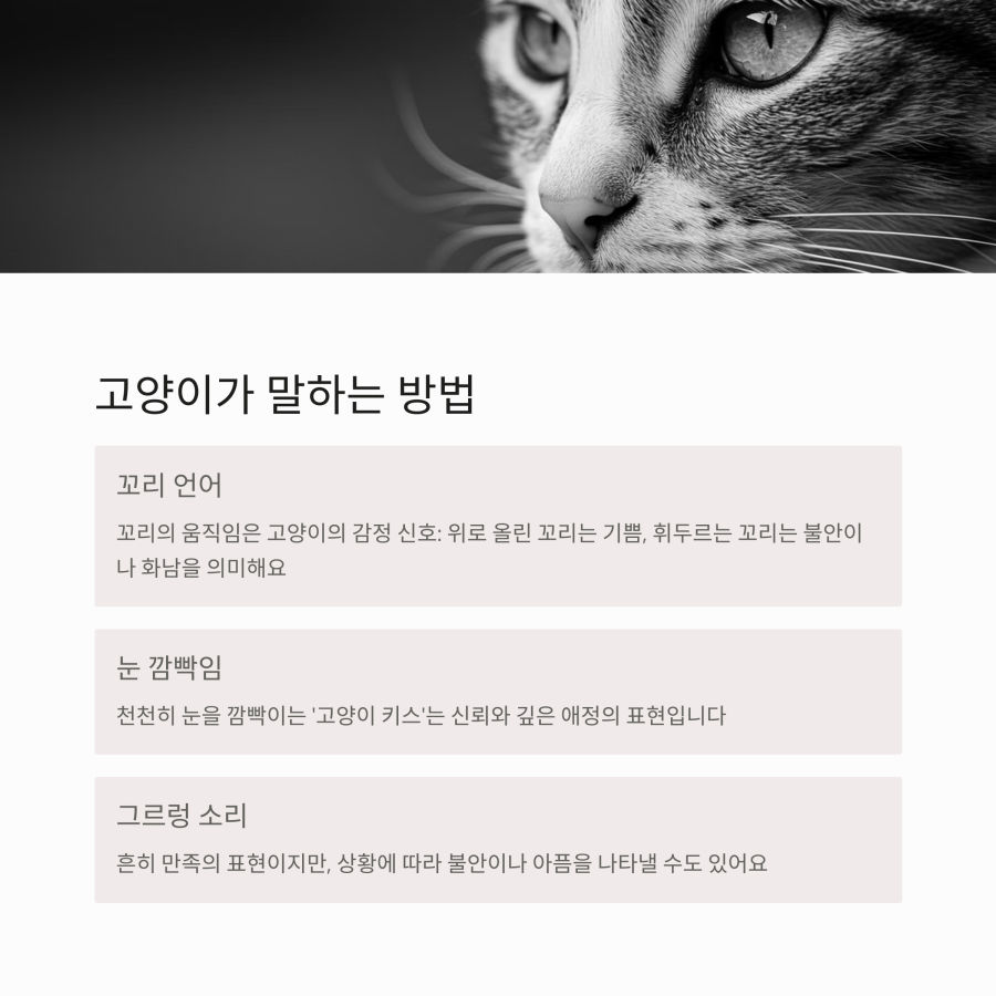 | 기쁨 | 꼬리 흔들기, 활발한 움직임 | 그르렁 소리, 꼬리 세우기 |