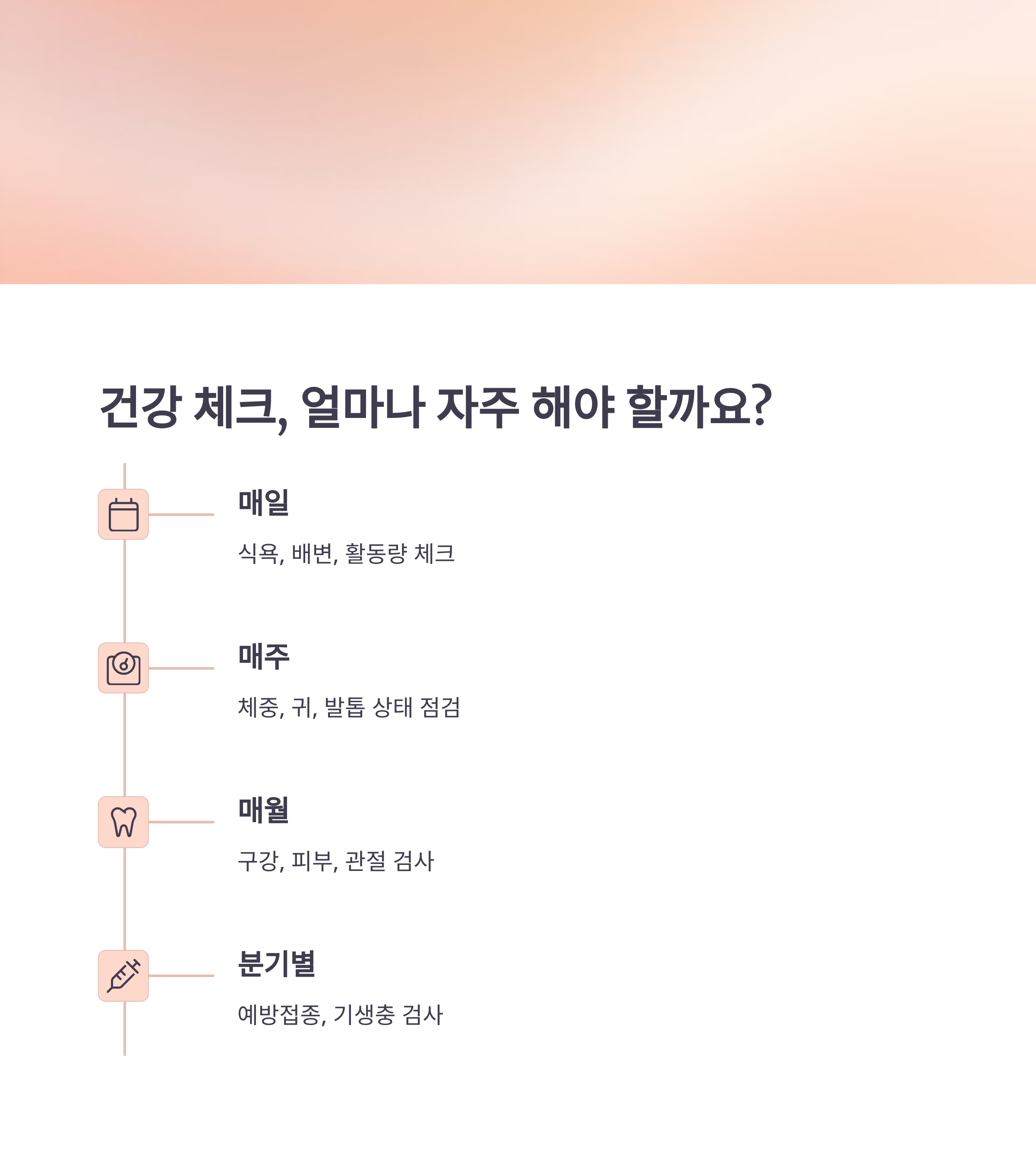 | 매주 | 체중 변화, 귀 청결도, 발톱 상태 |