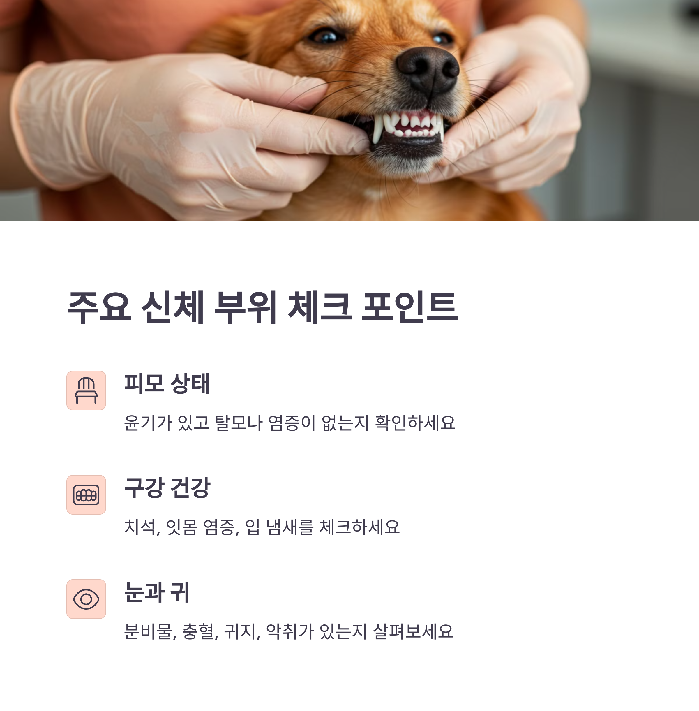 🐾 구강 건강 체크: 입 냄새가 심하거나 잇몸이 붉게 부어있다면 치과 질환을 의심해 볼 수 있습니다. 미국 수의 치과 협회는 정기적인 구강 검사와 치석 제거를 권장합니다.
