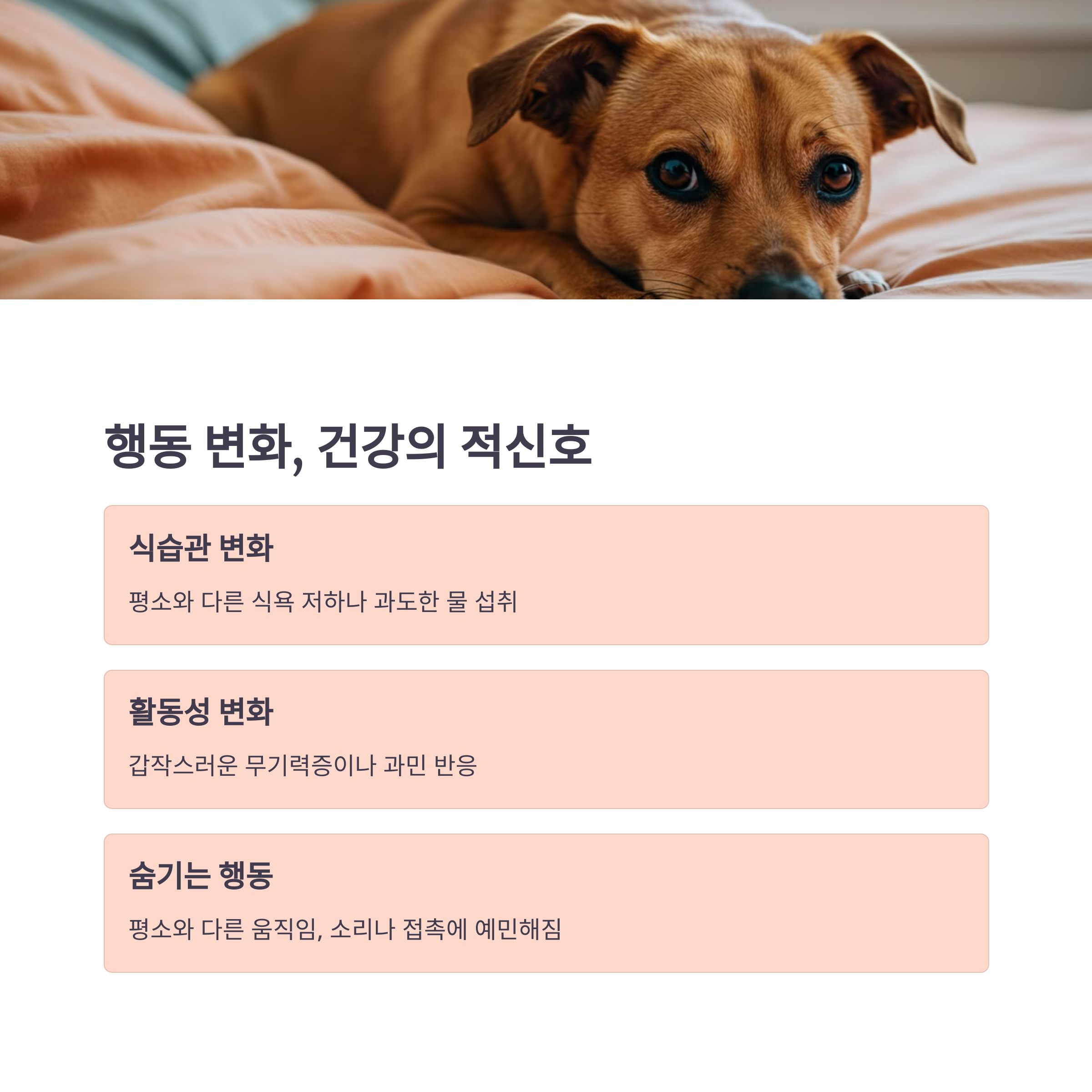 반려동물은 아플 때 본능적으로 증상을 숨기려는 경향이 있습니다. 따라서 미묘한 행동 변화에도 주의를 기울여야 합니다.