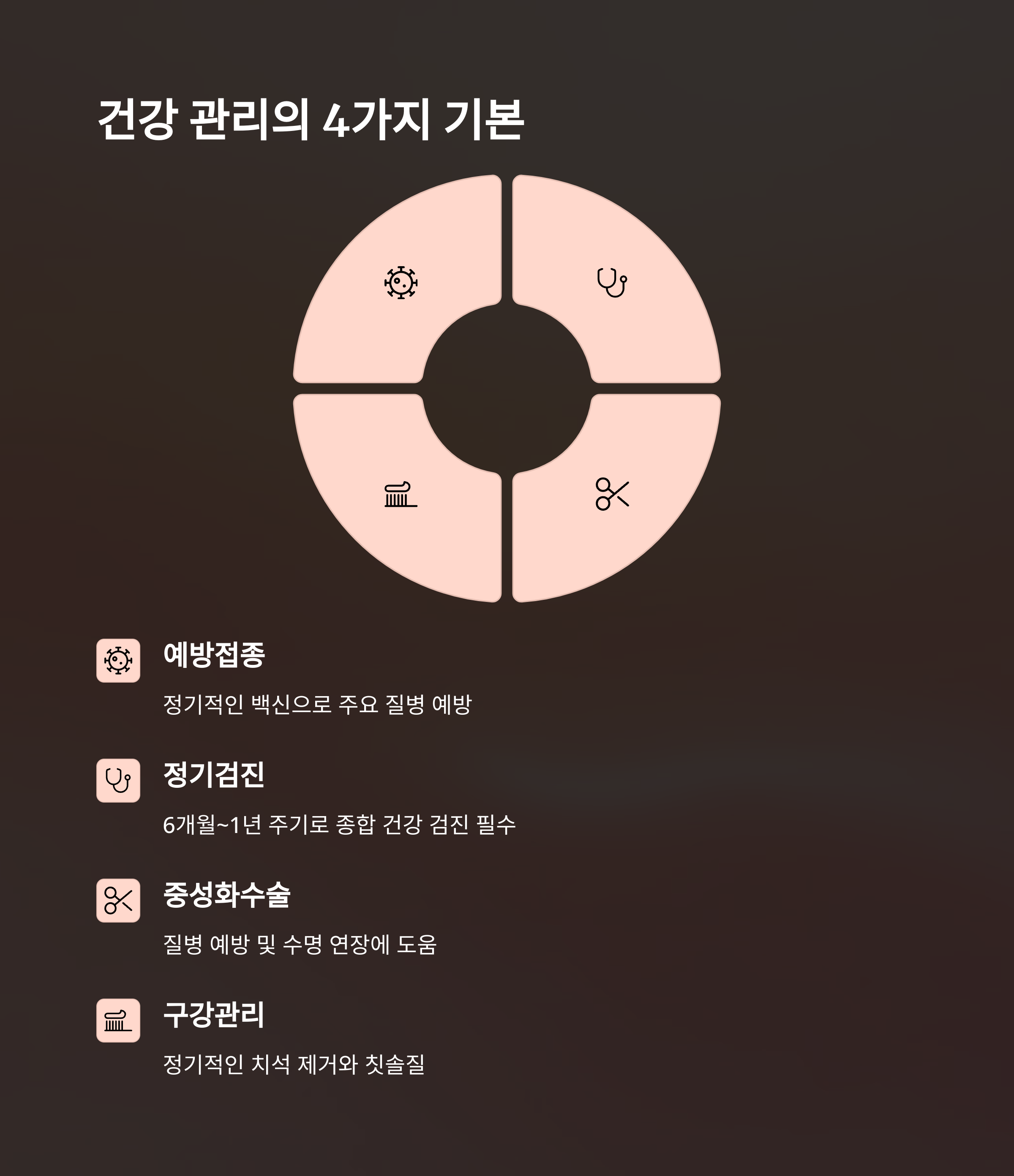 반려동물의 건강은 일상적인 관찰과 관리에서 시작됩니다. 정기적인 건강 체크와 수의사 상담을 통해 많은 질병을 예방하고 조기에 발견할 수 있습니다.