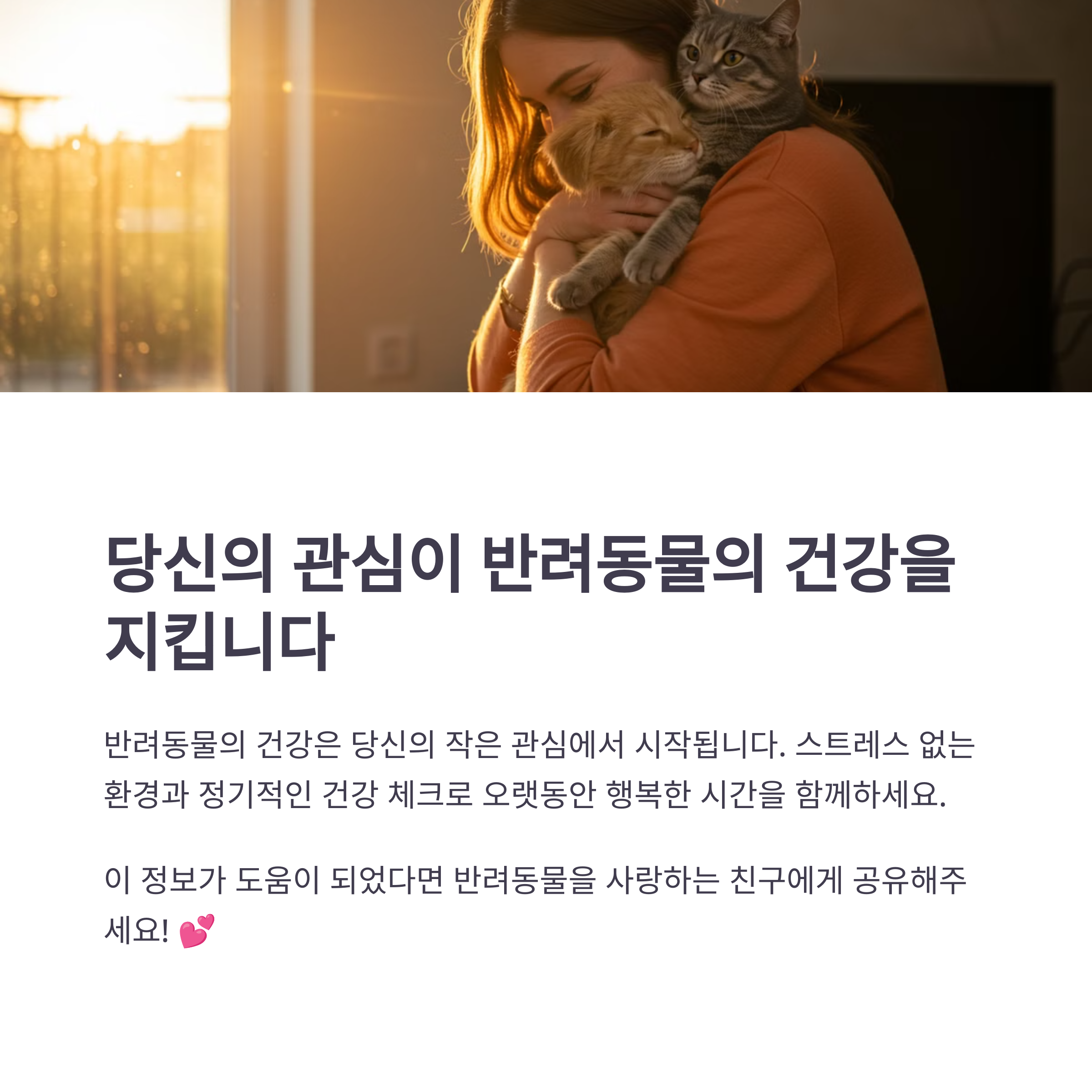 무엇보다 반려동물의 평소 행동과 습관을 잘 알고 있는 것이 중요합니다. 작은 변화도 놓치지 않고 관찰하는 보호자의 관심이 반려동물의 건강한 삶을 보장하는 첫걸음입니다.