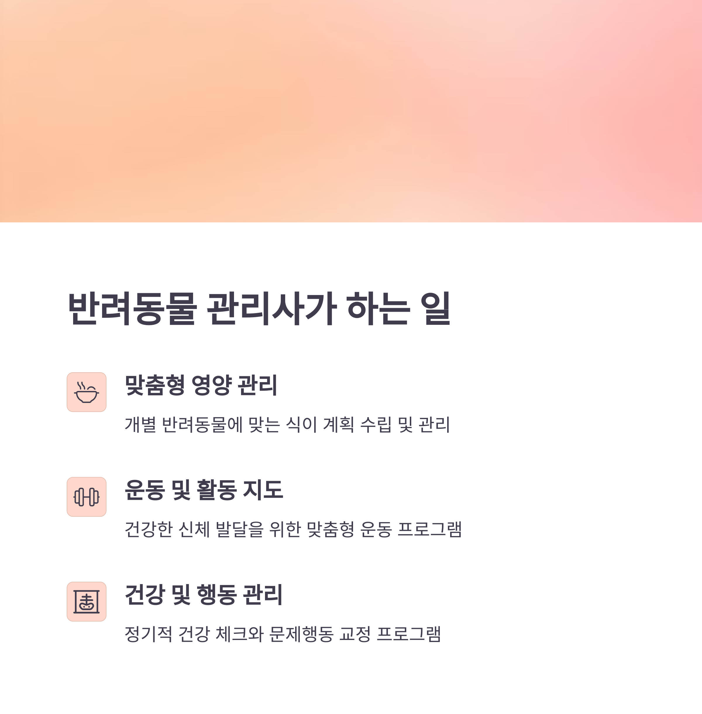 반려동물 관리사는 단순히 동물을 돌보는 것을 넘어 동물의 영양 관리, 행동 교정, 위생 관리 등 전문적인 케어를 제공하는 전문가예요.