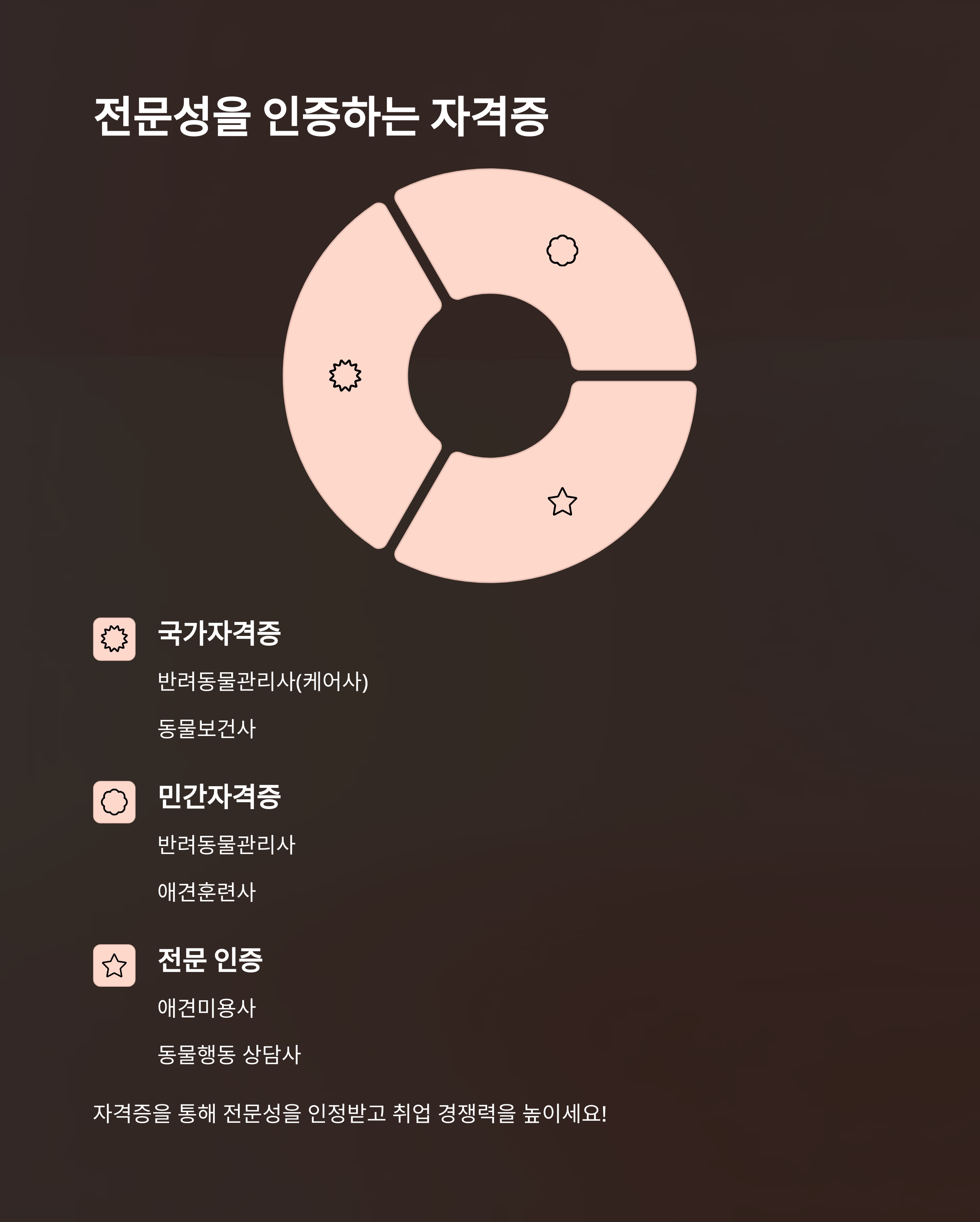 🏆 대표적인 국가자격증으로는 반려동물관리사(케어사)가 있으며, 농림축산식품부에서 주관하는 동물보건사도 주목받고 있어요.