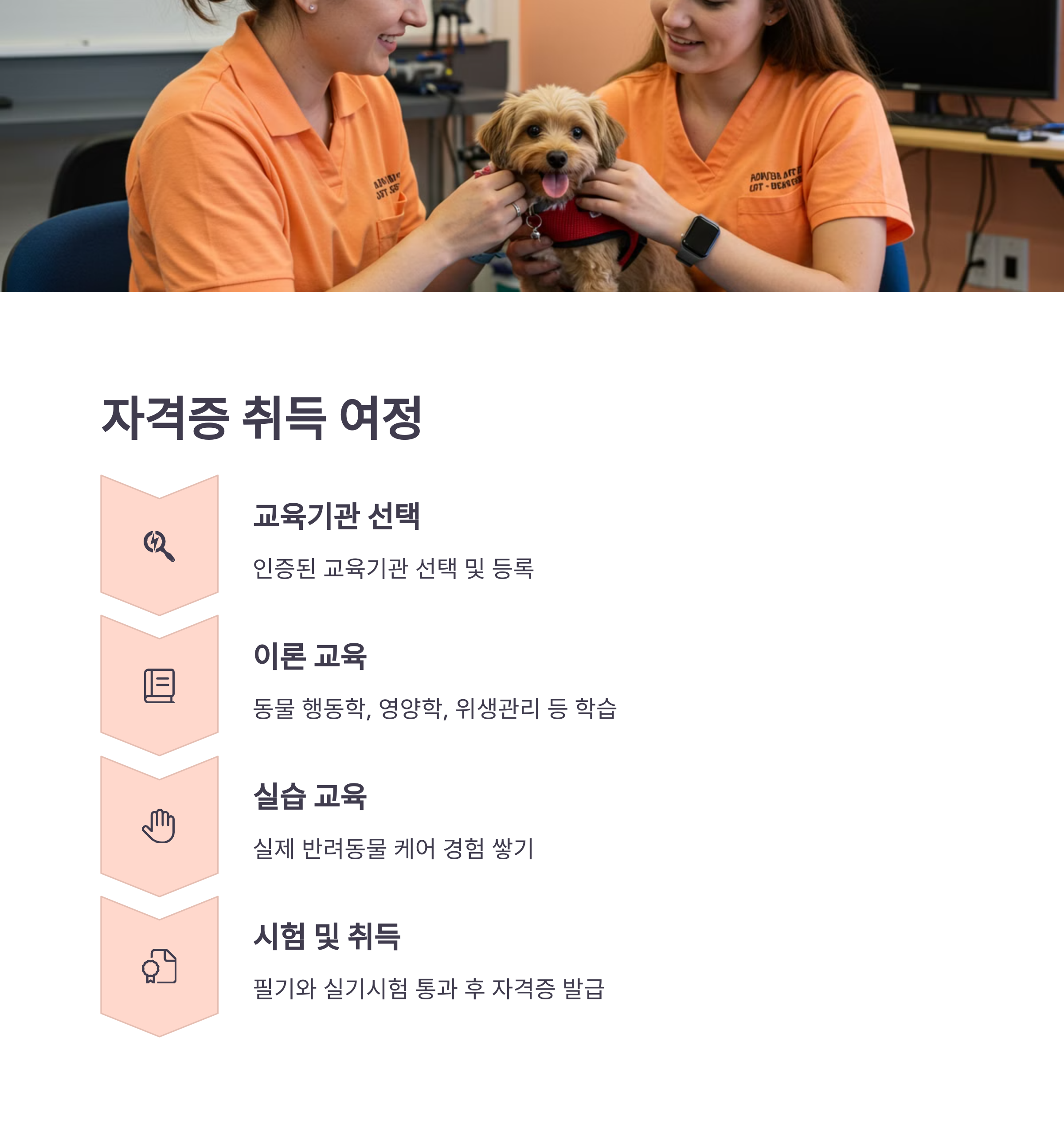 1️⃣ 먼저 교육기관에서 운영하는 반려동물 관리 과정을 수강해야 해요. 대부분 이론 교육과 실습 교육으로 구성되어 있답니다.