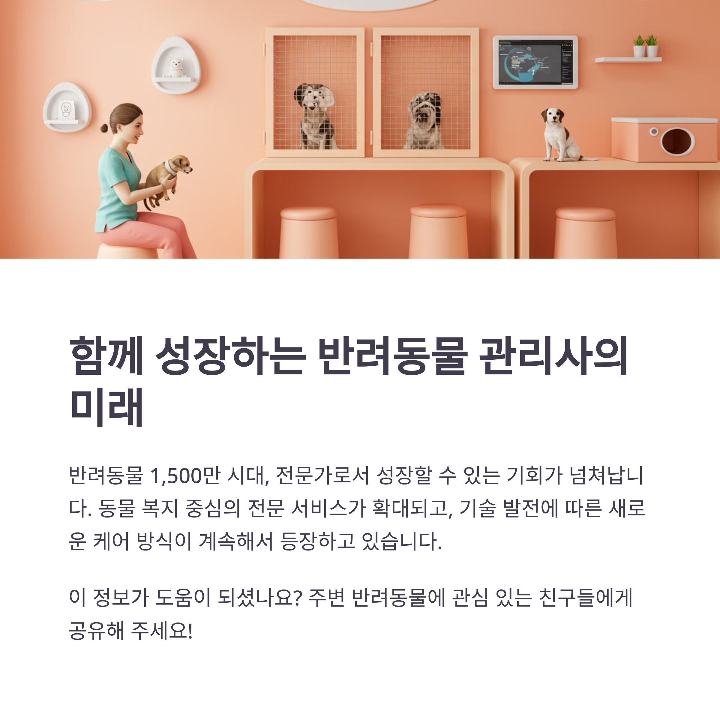 특히 전문성을 갖춘 반려동물 관리사는 앞으로 더욱 다양한 분야에서 활약할 수 있을 거예요. 여러분의 도전을 응원합니다!