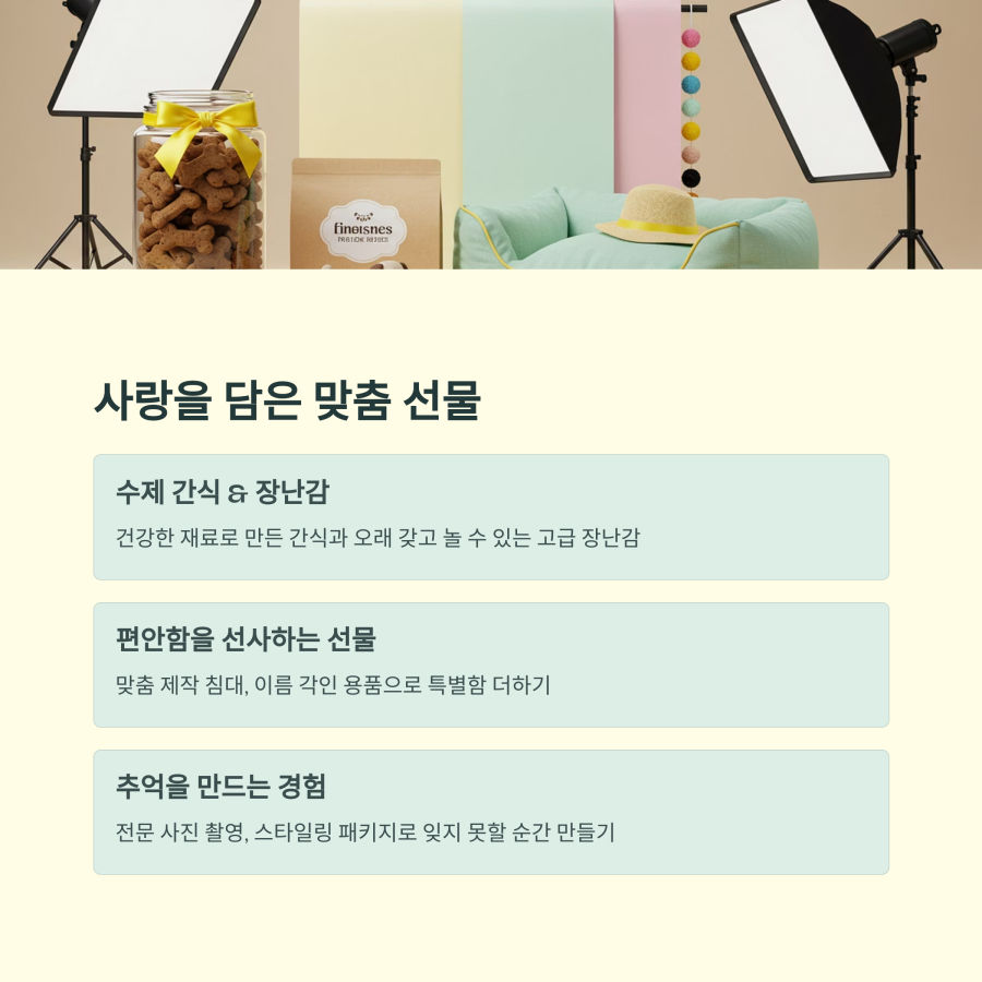 요즘에는 반려동물 전용 사진 촬영 서비스나 맞춤형 초상화 같은 특별한 경험을 선물하는 분들도 많답니다.