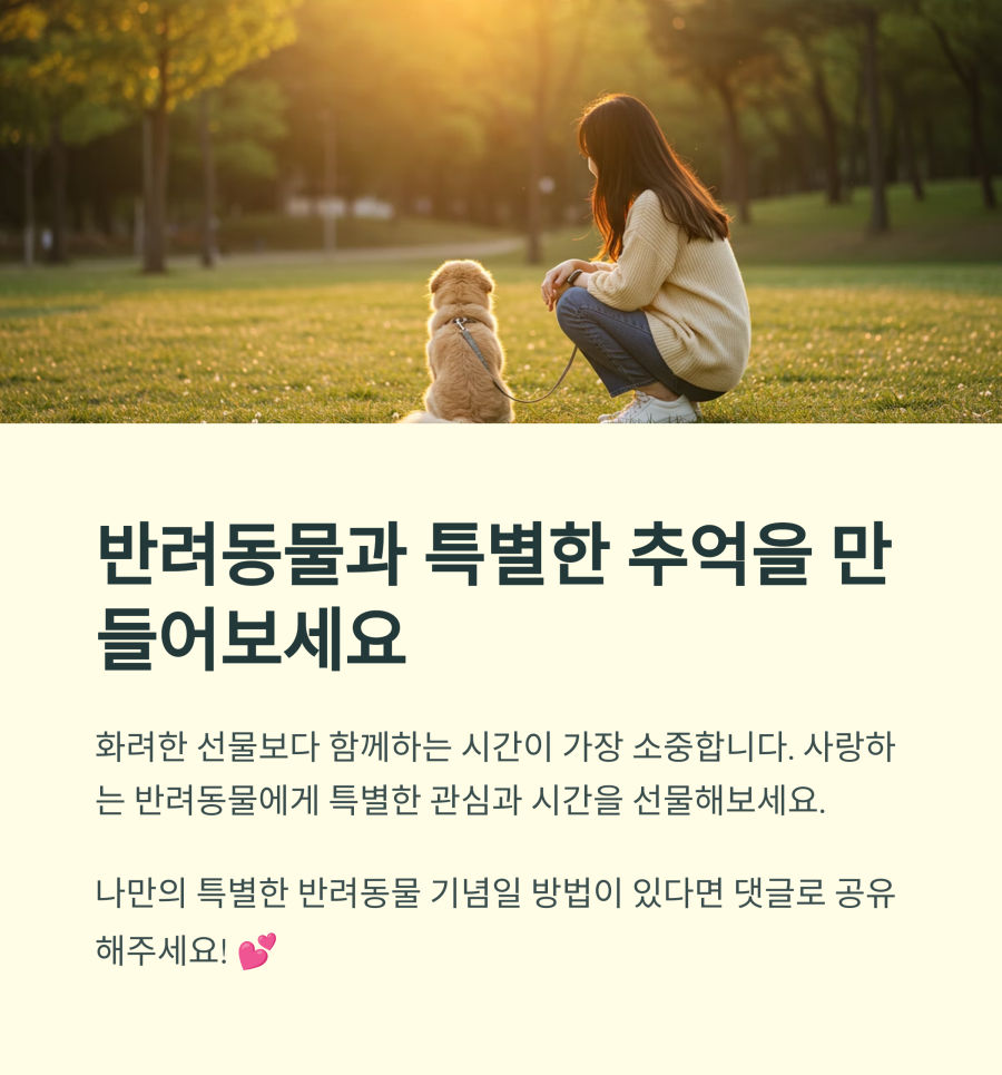 | 너무 부담 갖지 마세요! 특별한 간식과 평소보다 긴 산책, 함께하는 놀이시간만으로도 충분해요. 무엇보다 반려동물이 편안하게 즐길 수 있는 방식으로 시작하는 것이 중요해요. |