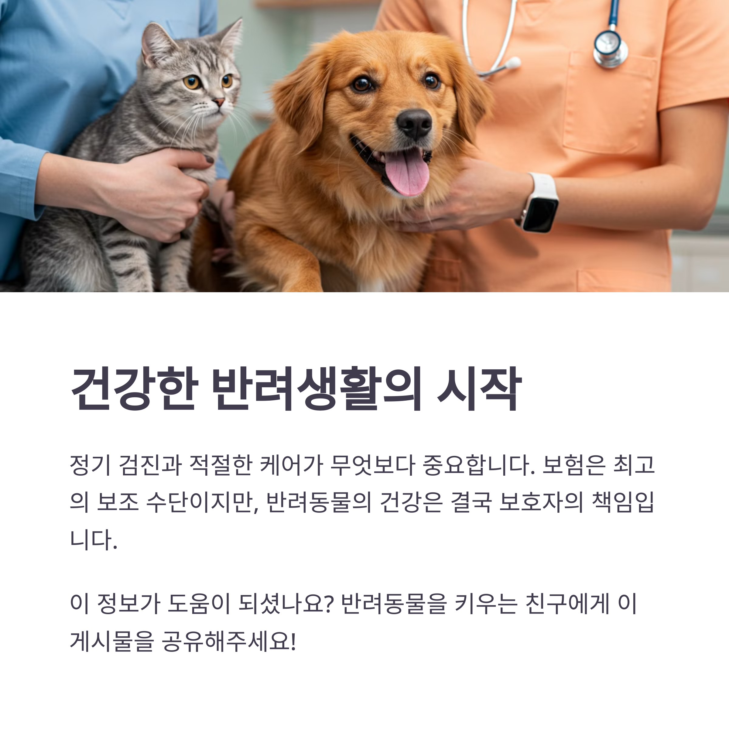 무엇보다 중요한 것은 보험 가입 여부와 상관없이, 반려동물의 건강을 위한 관심과 사랑입니다. 정기적인 검진과 적절한 케어로 건강한 반려생활을 유지하세요.